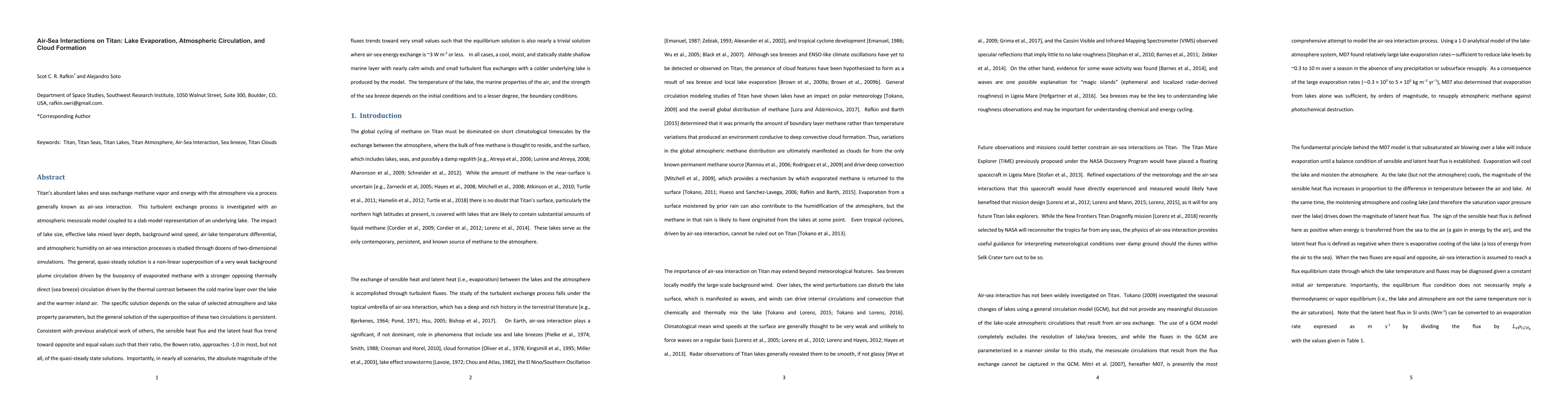 This study investigates Titan's air-sea interactions using a coupled mesoscale atmospheric model and lake slab model, focusing on lake evaporation, atmospheric circulation, and cloud formation. The research finds that the interaction results in a persistent superposition of weak plume and stronger thermally direct circulations, with minimal energy exchange, leading to a stable, calm, and cool marine layer over the lakes.