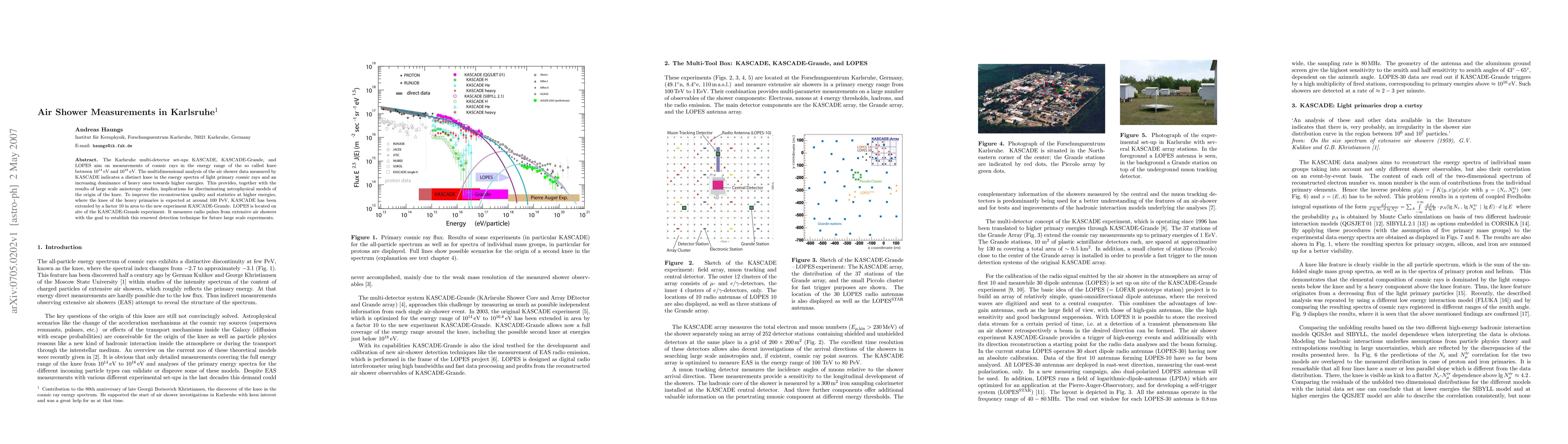 The Karlsruhe multi-detector set-ups KASCADE, KASCADE-Grande, and LOPES aim on measurements of cosmic rays in the energy range of the so called knee between 10^14 eV and 10^18 eV. The multidimensional analysis of the air shower data measured by KASCADE indicates a distinct knee in the energy spectra of light primary cosmic rays and an increasing dominance of heavy ones towards higher energies. This provides, together with the results of large scale anisotropy studies, implications for discriminating astrophysical models of the origin of the knee. To improve the reconstruction quality and statistics at higher energies, where the knee of the heavy primaries is expected at around 100 PeV, KASCADE has been extended by a factor 10 in area to the new experiment KASCADE-Grande. LOPES is located on site of the KASCADE-Grande experiment. It measures radio pulses from extensive air showers with the goal to establish this renewed detection technique for future large scale experiments.