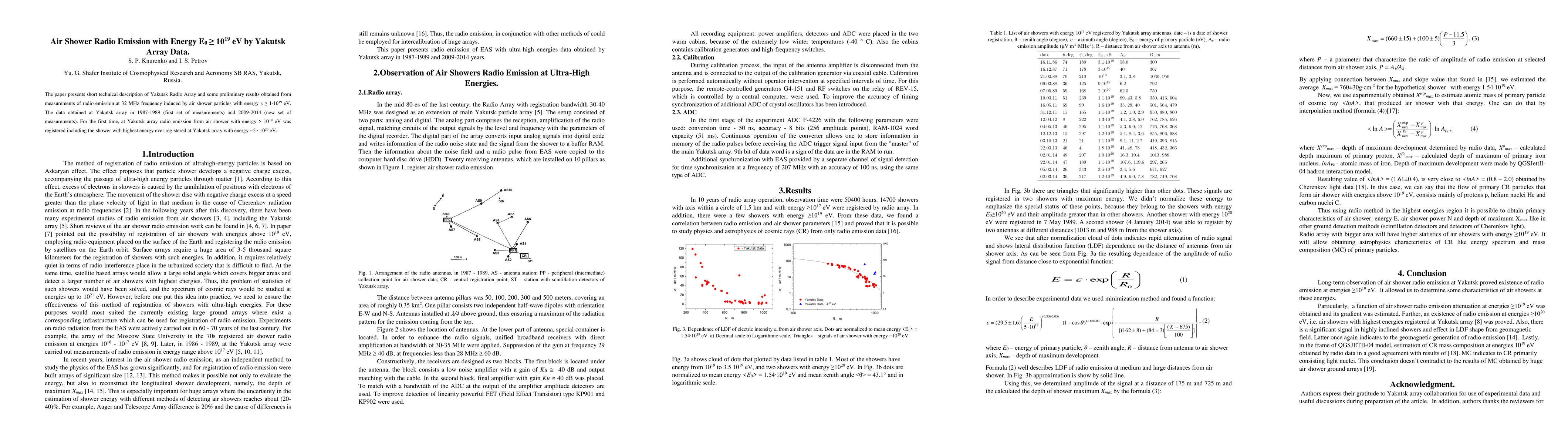 The Yakutsk Air Array study details its operation and reports the first detection of radio emissions from ultra-high-energy air showers (>10^19 eV), including a shower with an estimated energy of ~2*10^20 eV, at 32 MHz frequency, based on data collected between 1987-1989 and 2009-2014.