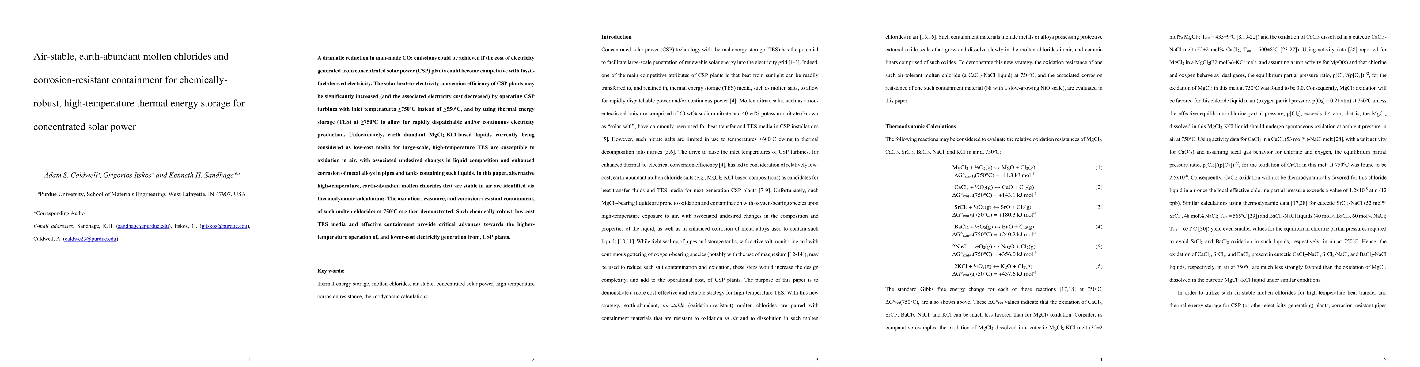A dramatic reduction in man-made CO2 emissions could be achieved if the cost of electricity generated from concentrated solar power (CSP) plants could become competitive with fossil-fuel-derived electricity. The solar heat-to-electricity conversion efficiency of CSP plants may be significantly increased (and the associated electricity cost decreased) by operating CSP turbines with inlet temperatures >750 C instead of <550 C, and by using thermal energy storage (TES) at >750 C to allow for rapidly dispatchable and/or continuous electricity production. Unfortunately, earth-abundant MgCl2-KCl-based liquids currently being considered as low-cost media for large-scale, high-temperature TES are susceptible to oxidation in air, with associated undesired changes in liquid composition and enhanced corrosion of metal alloys in pipes and tanks containing such liquids. In this paper, alternative high-temperature, earth-abundant molten chlorides that are stable in air are identified via thermodynamic calculations. The oxidation resistance, and corrosion-resistant containment, of such molten chlorides at 750 C are then demonstrated. Such chemically-robust, low-cost TES media and effective containment provide critical advances towards the higher-temperature operation of, and lower-cost electricity generation from, CSP plants.
