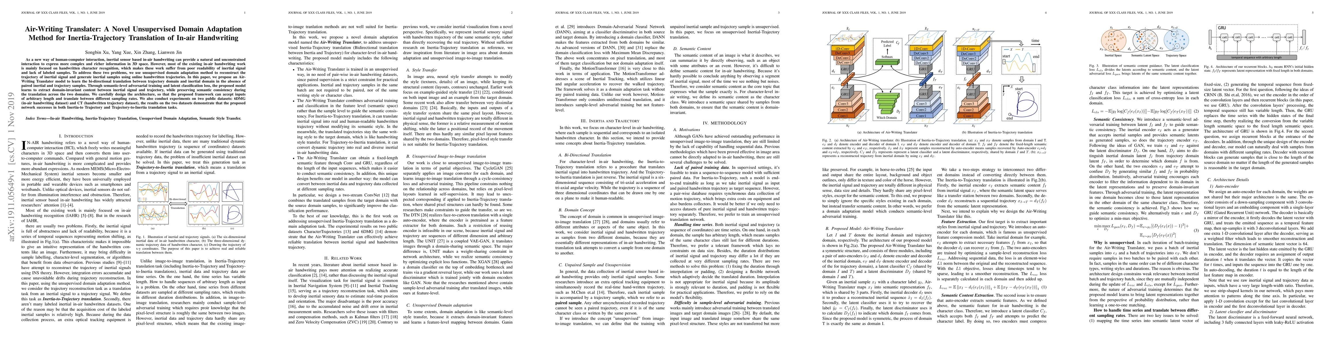 As a new way of human-computer interaction, inertial sensor based in-air handwriting can provide a natural and unconstrained interaction to express more complex and richer information in 3D space. However, most of the existing in-air handwriting work is mainly focused on handwritten character recognition, which makes these work suffer from poor readability of inertial signal and lack of labeled samples. To address these two problems, we use unsupervised domain adaptation method to reconstruct the trajectory of inertial signal and generate inertial samples using online handwritten trajectories. In this paper, we propose an AirWriting Translater model to learn the bi-directional translation between trajectory domain and inertial domain in the absence of paired inertial and trajectory samples. Through semantic-level adversarial training and latent classification loss, the proposed model learns to extract domain-invariant content between inertial signal and trajectory, while preserving semantic consistency during the translation across the two domains. We carefully design the architecture, so that the proposed framework can accept inputs of arbitrary length and translate between different sampling rates. We also conduct experiments on two public datasets: 6DMG (in-air handwriting dataset) and CT (handwritten trajectory dataset), the results on the two datasets demonstrate that the proposed network successes in both Inertia-to Trajectory and Trajectory-to-Inertia translation tasks.