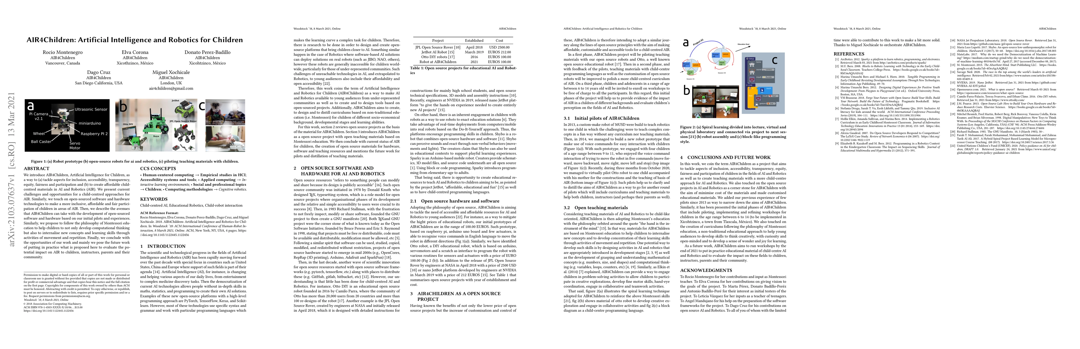 The AIR4Children initiative aims to promote inclusivity, affordability, and fairness in children's access to AI and robotics through open-sourced tools, inspired by Montessori education principles to develop computational thinking and practical skills. Future work will focus on evaluating the impact of these initiatives on children, educators, and their communities.