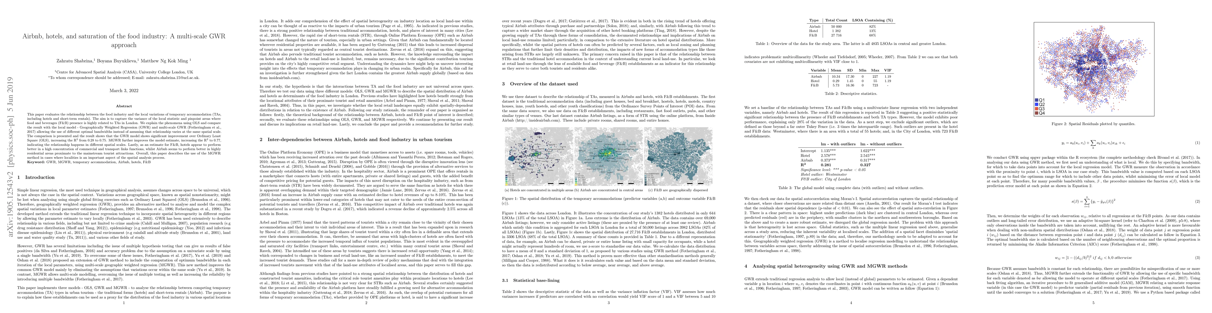 This study uses a multi-scale Geographically Weighted Regression approach to analyze the relationship between temporary accommodations (hotels and Airbnb) and food industry presence in London, finding that hotels perform better in commercial areas and Airbnb in residential areas nearby tourist attractions.