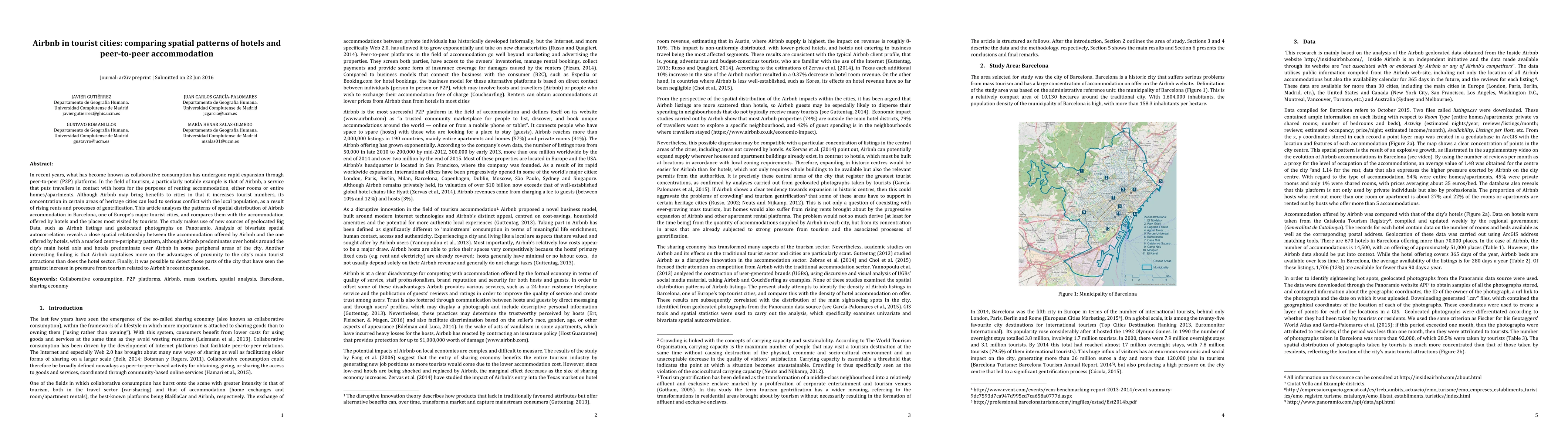 In recent years, what has become known as collaborative consumption has undergone rapid expansion through peer-to-peer (P2P) platforms. In the field of tourism, a particularly notable example is that of Airbnb. This article analyses the spatial patterns of Airbnb in Barcelona and compares them with hotels and sightseeing spots. New sources of data, such as Airbnb listings and geolocated photographs are used. Analysis of bivariate spatial autocorrelation reveals a close spatial relationship between Airbnb and hotels, with a marked centre-periphery pattern, although Airbnb predominates around the main hotel axis and hotels predominate in some peripheral areas of the city. Another interesting finding is that Airbnb capitalises more on the advantages of proximity to the main tourist attractions of the city than does the hotel sector. Finally, it was possible to detect those parts of the city that have seen the greatest increase in pressure from tourism related to Airbnb's recent expansion.