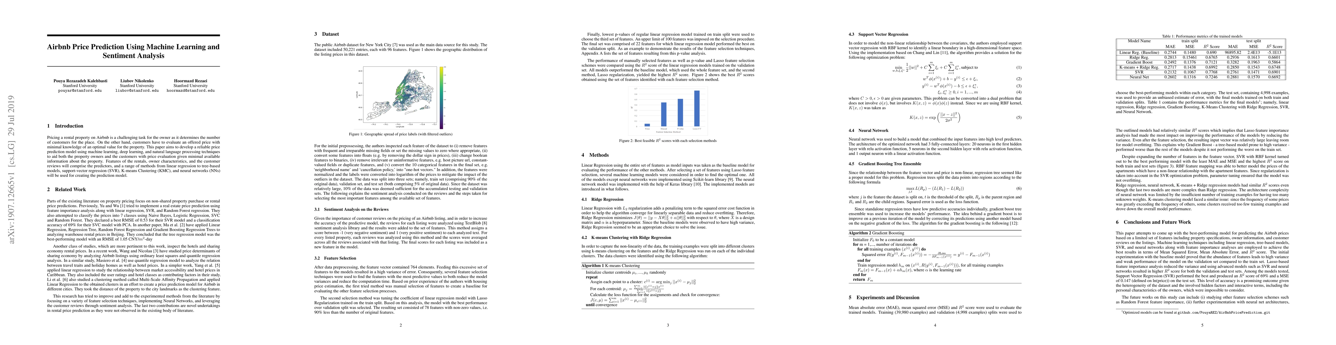 This paper develops a price prediction model for Airbnb rentals using machine learning, deep learning, and sentiment analysis, incorporating features like rental characteristics, owner details, and customer reviews. It employs various techniques including linear regression, tree-based models, SVR, K-means Clustering, and neural networks to assist both owners and customers in evaluating property prices.