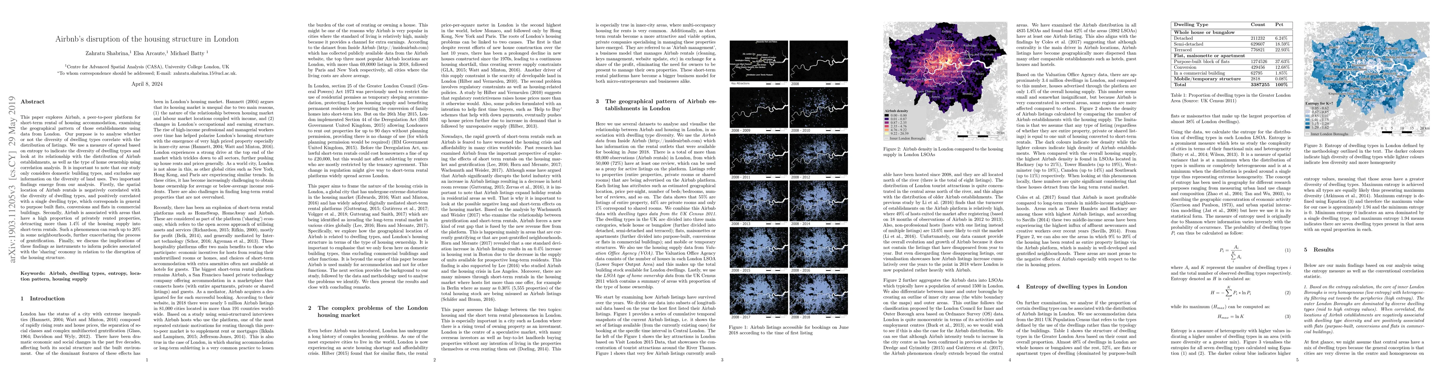 This paper explores Airbnb, a peer-to-peer platform for short-term rental of housing accommodation, examining the geographical pattern of those establishments using data from London. Our purpose is to analyse whether or not the diversity of dwelling types correlate with the distribution of listings. We use a measure of spread based on entropy to indicate the diversity of dwelling types and look at its relationship with the distribution of Airbnb establishments, as well as the type of home ownership using correlation analysis. It is important to note that our study only considers domestic building types, and excludes any information on the diversity of land uses. Two important findings emerge from our analysis. Firstly, the spatial location of Airbnb rentals is negatively correlated with the diversity of dwelling types, and positively correlated with a single dwelling type, which corresponds in general to purpose built flats, conversions and flats in commercial buildings. Secondly, Airbnb is associated with areas that have a high proportion of privately rented properties, detracting more than 1.4% of the housing supply into short-term rentals. Such a phenomenon can reach up to 20% in some neighbourhoods, further exacerbating the process of gentrification. Finally, we discuss the implications of these findings as instruments to inform policies associated with the 'sharing' economy in relation to the disruption of the housing structure.