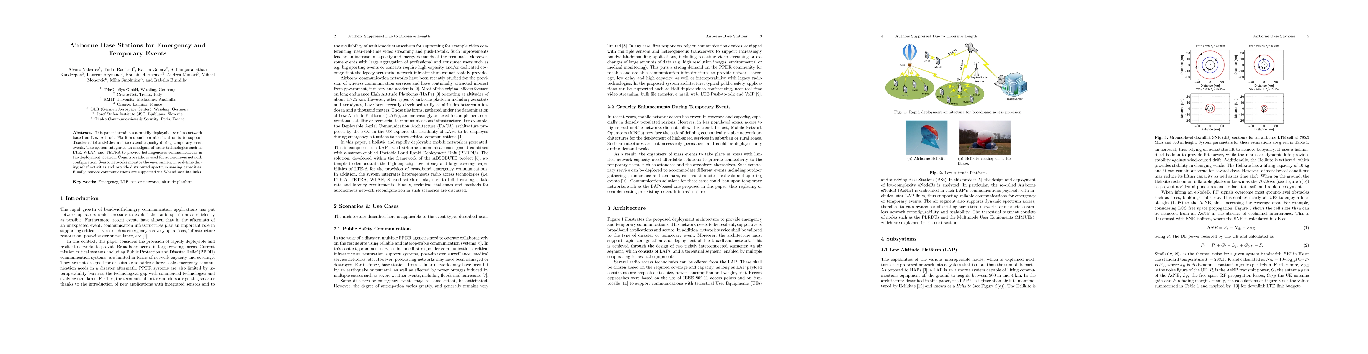 This paper introduces a rapidly deployable wireless network based on Low Altitude Platforms and portable land units to support disaster-relief activities, and to extend capacity during temporary mass events. The system integrates an amalgam of radio technologies such as LTE, WLAN and TETRA to provide heterogeneous communications in the deployment location. Cognitive radio is used for autonomous network configuration. Sensor networks monitor the environment in real-time during relief activities and provide distributed spectrum sensing capacities. Finally, remote communications are supported via S-band satellite links.