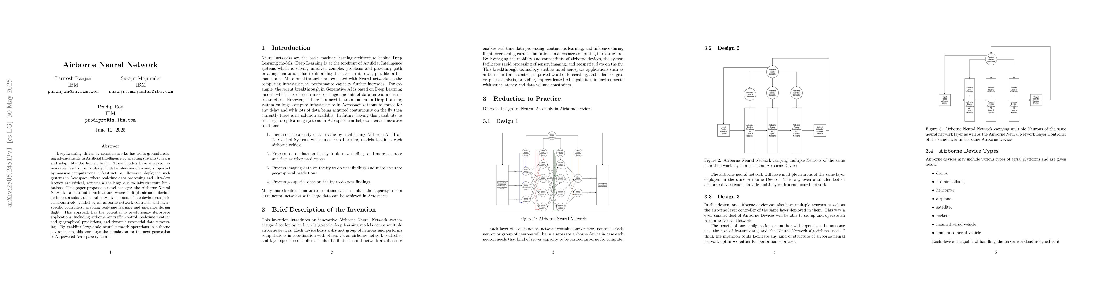 The paper proposes a novel Airborne Neural Network architecture, a distributed system where multiple airborne devices each host a subset of neural network neurons, enabling real-time learning and inference during flight.