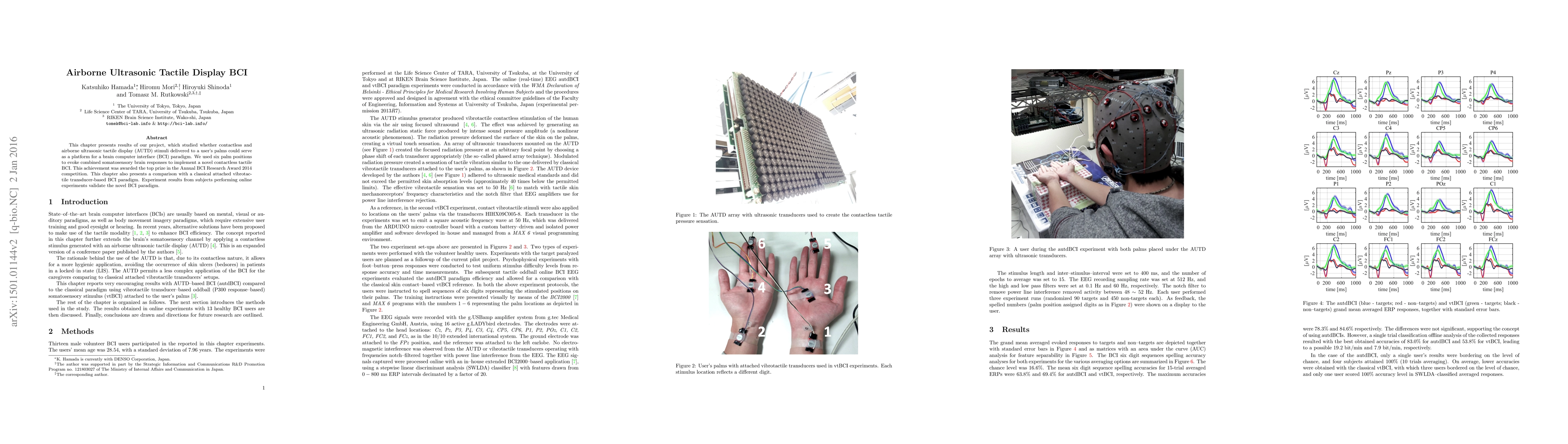 This chapter presents results of our project, which studied whether contactless and airborne ultrasonic tactile display (AUTD) stimuli delivered to a user's palms could serve as a platform for a brain computer interface (BCI) paradigm. We used six palm positions to evoke combined somatosensory brain responses to implement a novel contactless tactile BCI. This achievement was awarded the top prize in the Annual BCI Research Award 2014 competition. This chapter also presents a comparison with a classical attached vibrotactile transducer-based BCI paradigm. Experiment results from subjects performing online experiments validate the novel BCI paradigm.