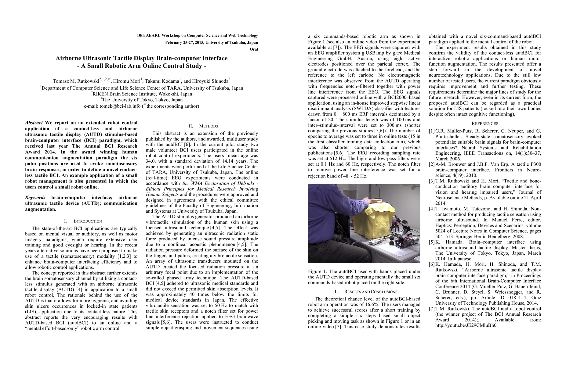 This study explores a contactless brain-computer interface (BCI) using airborne ultrasonic tactile display (AUTD) to evoke somatosensory brain responses from palm positions, enabling control of a small robotic arm online. The BCI paradigm won the 2014 Annual BCI Research Award and demonstrates potential for human communication augmentation.