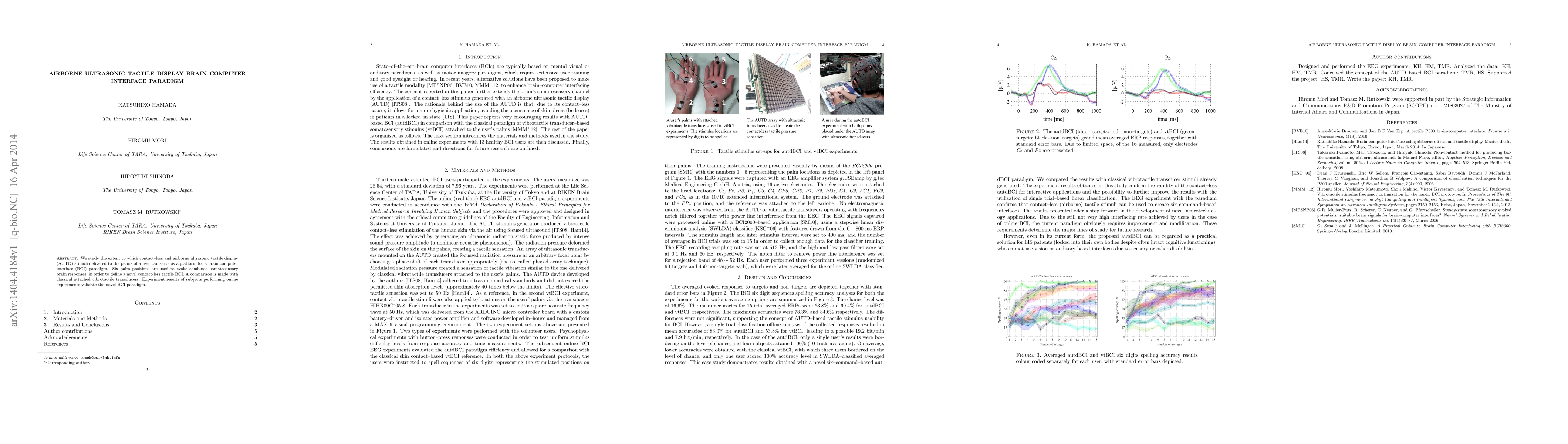 The paper presents a novel brain-computer interface (BCI) paradigm based on airborne ultrasonic tactile displays (AUTD) that utilizes contact-less tactile stimuli for more hygienic applications, particularly beneficial for patients in locked-in states.