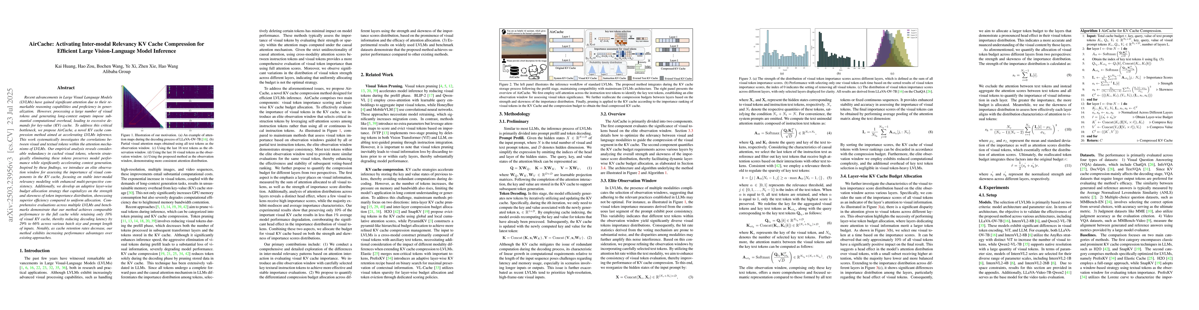 Recent advancements in Large Visual Language Models (LVLMs) have gained significant attention due to their remarkable reasoning capabilities and proficiency in generalization. However, processing a large number of visual tokens and generating long-context outputs impose substantial computational overhead, leading to excessive demands for key-value (KV) cache. To address this critical bottleneck, we propose AirCache, a novel KV cache compression method aimed at accelerating LVLMs inference. This work systematically investigates the correlations between visual and textual tokens within the attention mechanisms of LVLMs. Our empirical analysis reveals considerable redundancy in cached visual tokens, wherein strategically eliminating these tokens preserves model performance while significantly accelerating context generation. Inspired by these findings, we introduce an elite observation window for assessing the importance of visual components in the KV cache, focusing on stable inter-modal relevancy modeling with enhanced multi-perspective consistency. Additionally, we develop an adaptive layer-wise budget allocation strategy that capitalizes on the strength and skewness of token importance distribution, showcasing superior efficiency compared to uniform allocation. Comprehensive evaluations across multiple LVLMs and benchmarks demonstrate that our method achieves comparable performance to the full cache while retaining only 10% of visual KV cache, thereby reducing decoding latency by 29% to 66% across various batch size and prompt length of inputs. Notably, as cache retention rates decrease, our method exhibits increasing performance advantages over existing approaches.