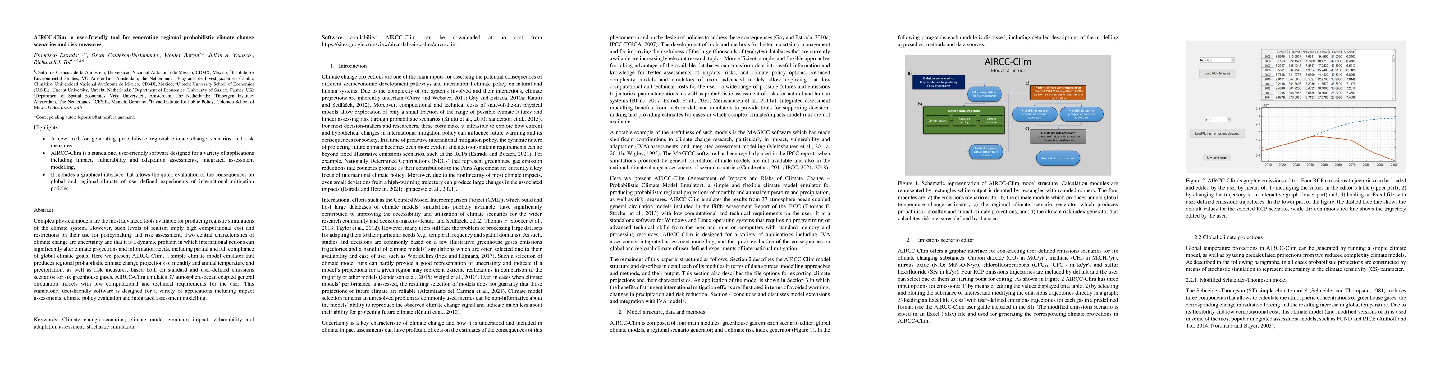 AIRCC-Clim is a user-friendly tool for generating regional probabilistic climate change scenarios, offering low-cost emulations of advanced climate models. It provides monthly and annual projections of temperature and precipitation, along with risk measures, based on various emissions scenarios, facilitating policymaking and risk assessments.