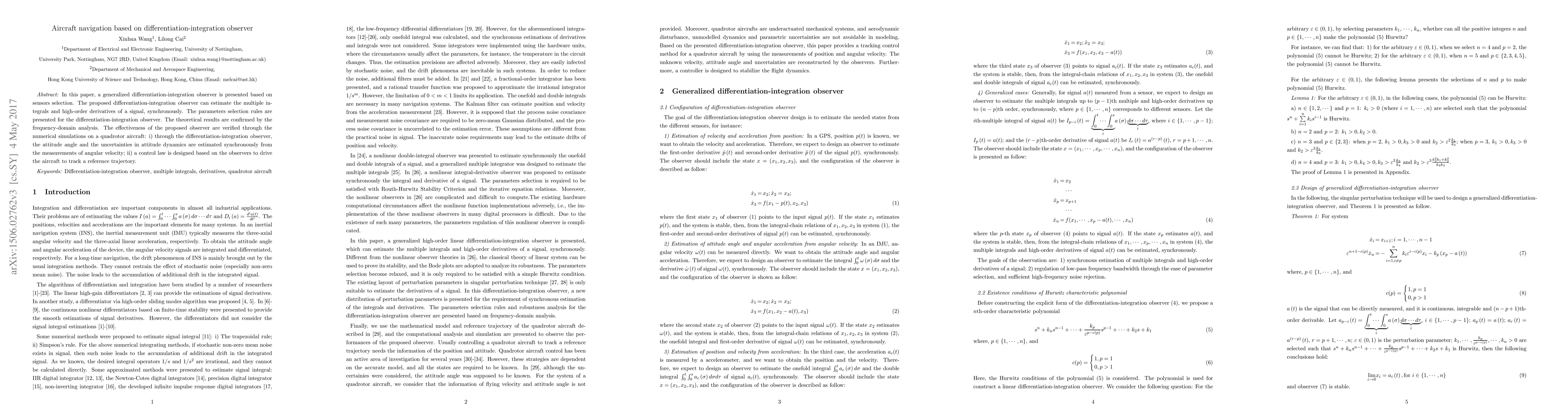 This paper introduces a generalized differentiation-integration observer for aircraft navigation, capable of estimating multiple integrals and high-order derivatives synchronously. The observer is validated through frequency-domain analysis and numerical simulations on a quadrotor, demonstrating its effectiveness in estimating attitude angles and uncertainties, and aiding in trajectory tracking.