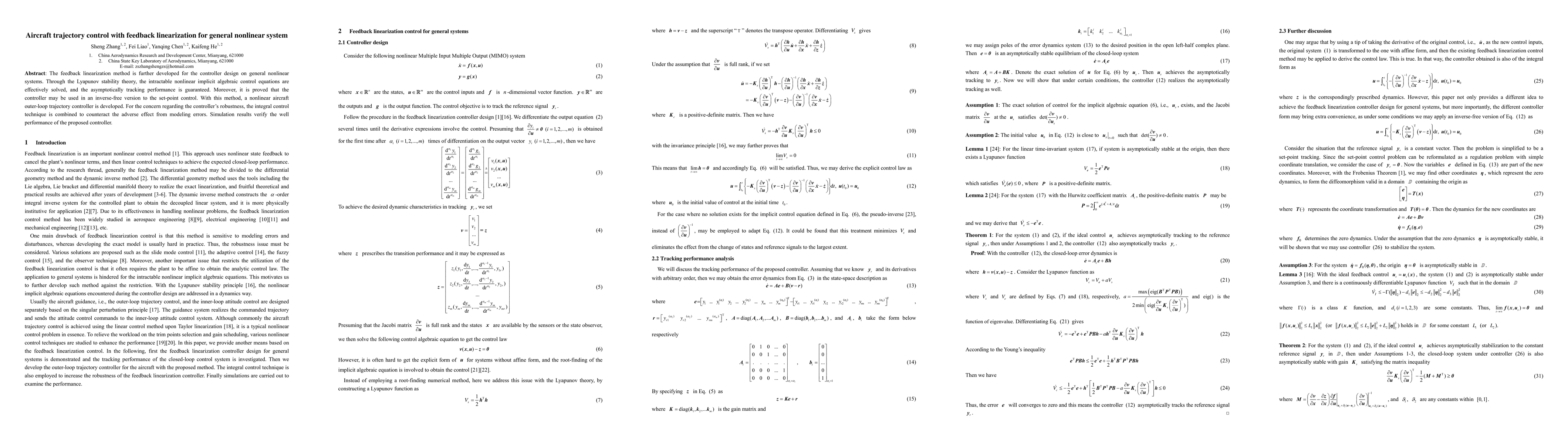 The paper develops a feedback linearization method for general nonlinear systems, utilizing Lyapunov stability theory to solve complex control equations and ensuring asymptotic tracking. It integrates inverse-free control and robust integral control for aircraft trajectory control, validated by successful simulations.