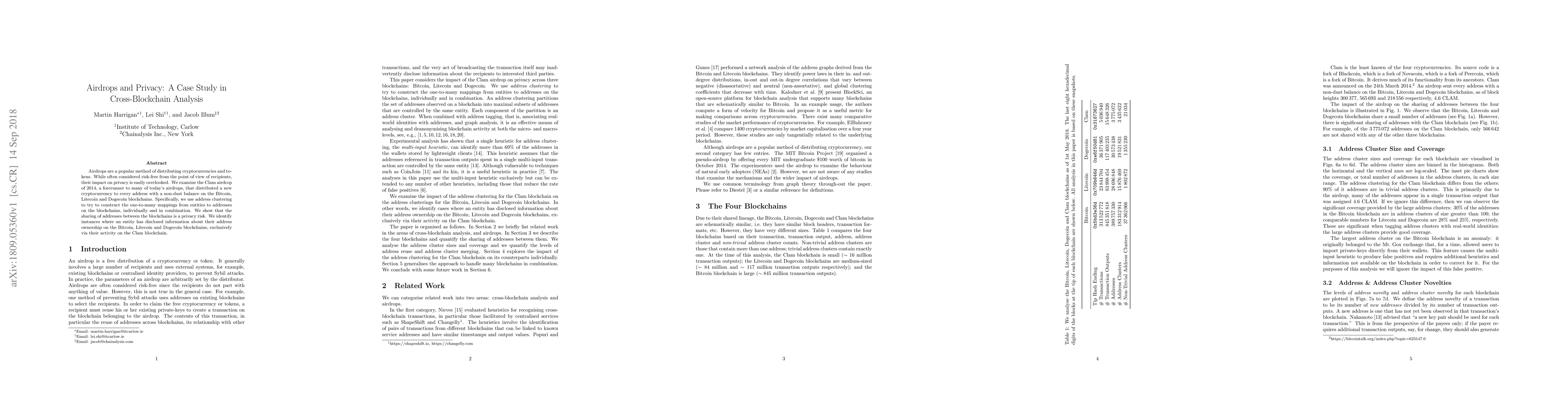 A study analyzed a 2014 cryptocurrency airdrop to show that sharing addresses between blockchains can pose a privacy risk. The research highlights instances where entities revealed address information via blockchain activity on the Airdrop's underlying chain.