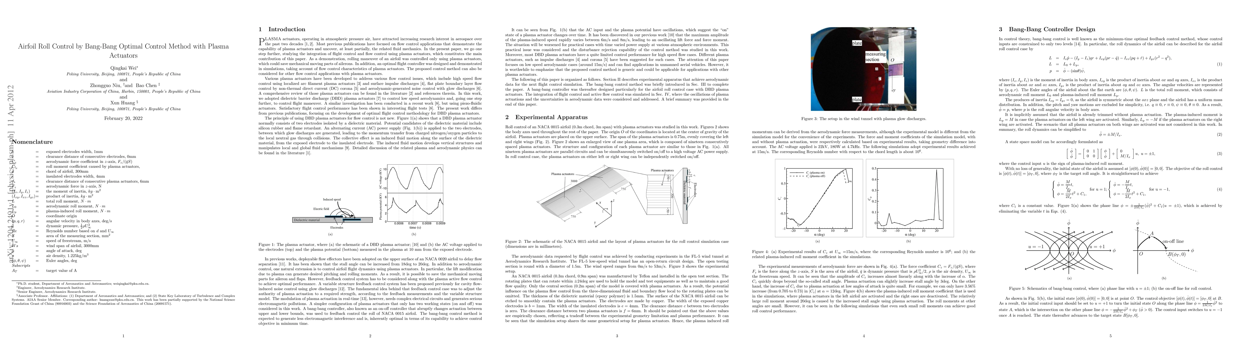 This paper proposes a bang-bang optimal control method for glow discharge plasma actuators to enhance airfoil roll control, demonstrating limited but effective flow control near stall angles in wind tunnel tests. Simulation results suggest that small plasma-induced roll moments can meet flight quality specifications and reject disturbances, indicating the method's potential for practical flight control applications.