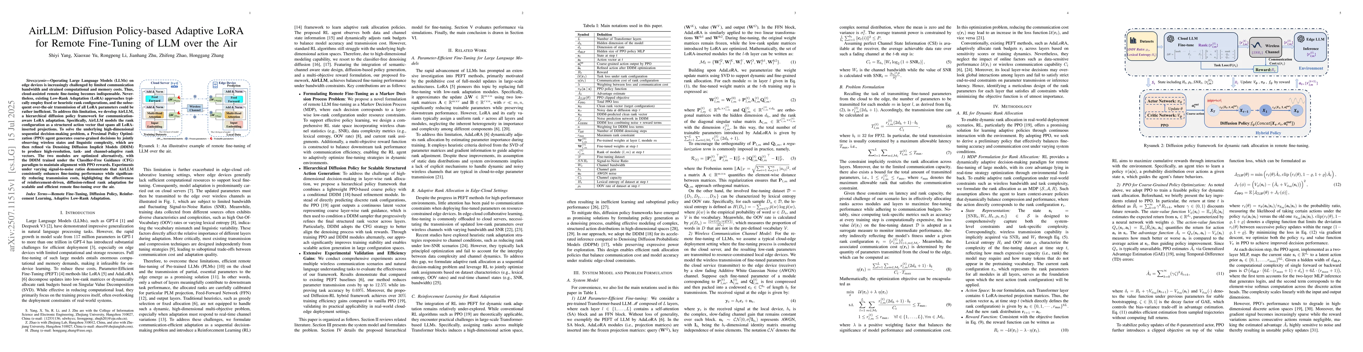 Operating Large Language Models (LLMs) on edge devices is increasingly challenged by limited communication bandwidth and strained computational and memory costs. Thus, cloud-assisted remote fine-tuning becomes indispensable. Nevertheless, existing Low-Rank Adaptation (LoRA) approaches typically employ fixed or heuristic rank configurations, and the subsequent over-the-air transmission of all LoRA parameters could be rather inefficient. To address this limitation, we develop AirLLM, a hierarchical diffusion policy framework for communication-aware LoRA adaptation. Specifically, AirLLM models the rank configuration as a structured action vector that spans all LoRA-inserted projections. To solve the underlying high-dimensional sequential decision-making problem, a Proximal Policy Optimization (PPO) agent generates coarse-grained decisions by jointly observing wireless states and linguistic complexity, which are then refined via Denoising Diffusion Implicit Models (DDIM) to produce high-resolution, task- and channel-adaptive rank vectors. The two modules are optimized alternatively, with the DDIM trained under the Classifier-Free Guidance (CFG) paradigm to maintain alignment with PPO rewards. Experiments under varying signal-to-noise ratios demonstrate that AirLLM consistently enhances fine-tuning performance while significantly reducing transmission costs, highlighting the effectiveness of reinforcement-driven, diffusion-refined rank adaptation for scalable and efficient remote fine-tuning over the air.
