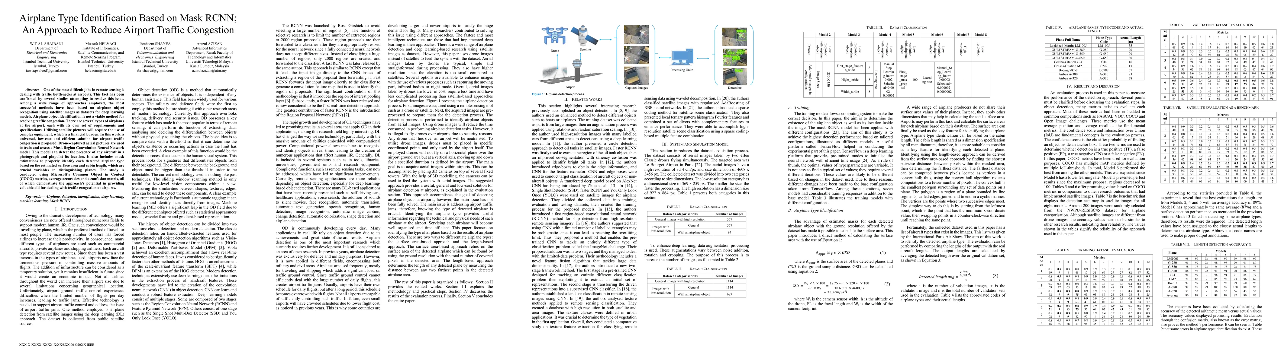 One of the most difficult jobs in remote sensing is dealing with traffic bottlenecks at airports. This fact has been confirmed by several studies attempting to resolve this issue. Among a wide range of approaches employed the most successful methods have been based on airplane object recognition using satellite images as datasets for deep learning models. Airplane object identification is not a viable method for resolving traffic congestion. There are several types of airplanes at the airport each with its own set of requirements and specifications.Utilizing satellite pictures will require the use of complex equipment which is a financial burden. In this work a universal low-cost and efficient solution for airport traffic congestion is proposed. Drone-captured aerial pictures are used to train and assess a Mask Region Convolution Neural Network model. This model can detect the presence of any aircraft in a photograph and pinpoint its location. It also includes mask estimations to properly identify each detected airplane type based on the estimated surface area and cabin length which are crucial variables in distinguishing planes. The study is conducted using Microsoft Common Object in Context COCO metrics average accuracies and a confusion matrix all of which demonstrate the approach's potential in providing valuable aid for dealing with traffic congestion at airports.