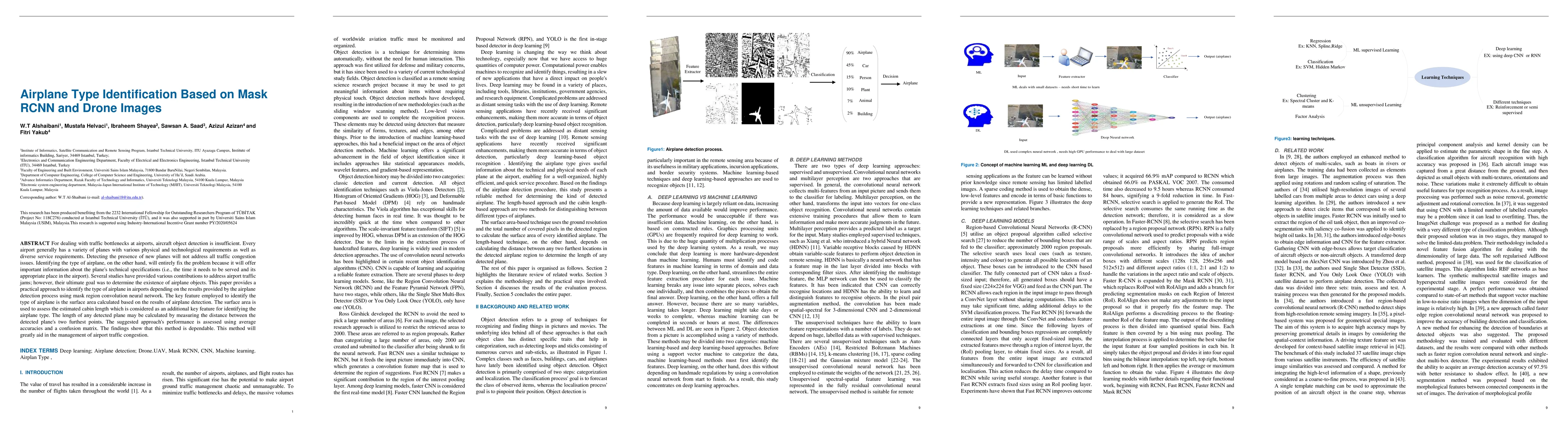 For dealing with traffic bottlenecks at airports, aircraft object detection is insufficient. Every airport generally has a variety of planes with various physical and technological requirements as well as diverse service requirements. Detecting the presence of new planes will not address all traffic congestion issues. Identifying the type of airplane, on the other hand, will entirely fix the problem because it will offer important information about the plane's technical specifications (i.e., the time it needs to be served and its appropriate place in the airport). Several studies have provided various contributions to address airport traffic jams; however, their ultimate goal was to determine the existence of airplane objects. This paper provides a practical approach to identify the type of airplane in airports depending on the results provided by the airplane detection process using mask region convolution neural network. The key feature employed to identify the type of airplane is the surface area calculated based on the results of airplane detection. The surface area is used to assess the estimated cabin length which is considered as an additional key feature for identifying the airplane type. The length of any detected plane may be calculated by measuring the distance between the detected plane's two furthest points. The suggested approach's performance is assessed using average accuracies and a confusion matrix. The findings show that this method is dependable. This method will greatly aid in the management of airport traffic congestion.