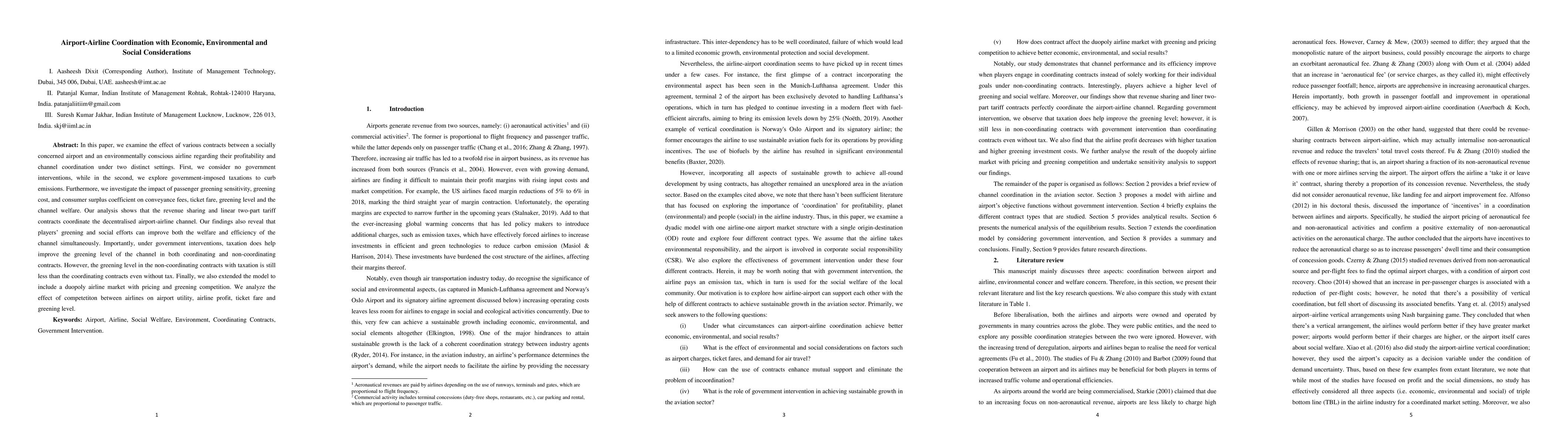 This paper investigates contract types between an environmentally conscious airline and a socially concerned airport, analyzing their profitability and coordination under government interventions and taxation. It finds that revenue sharing and linear two-part tariff contracts effectively coordinate the channel, while government-imposed taxation can enhance greening levels, though coordinating contracts still achieve higher greening levels.