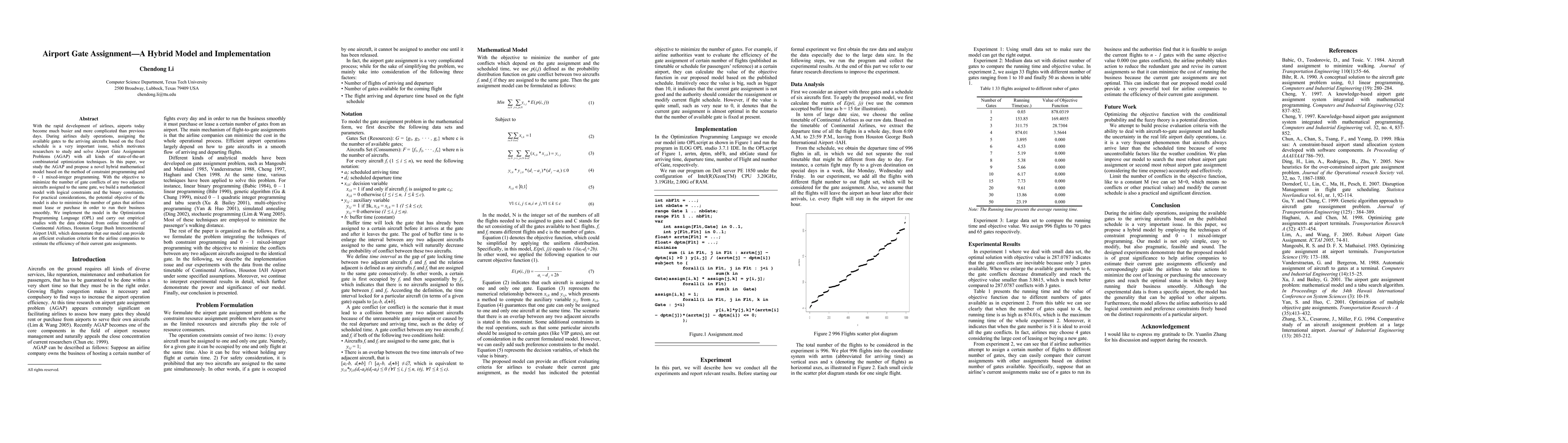 A new hybrid model for airport gate assignment minimizes gate conflicts while also considering cost savings from leasing fewer gates. The model provides an efficient evaluation criterion for airlines to estimate the efficiency of their current gate assignments.