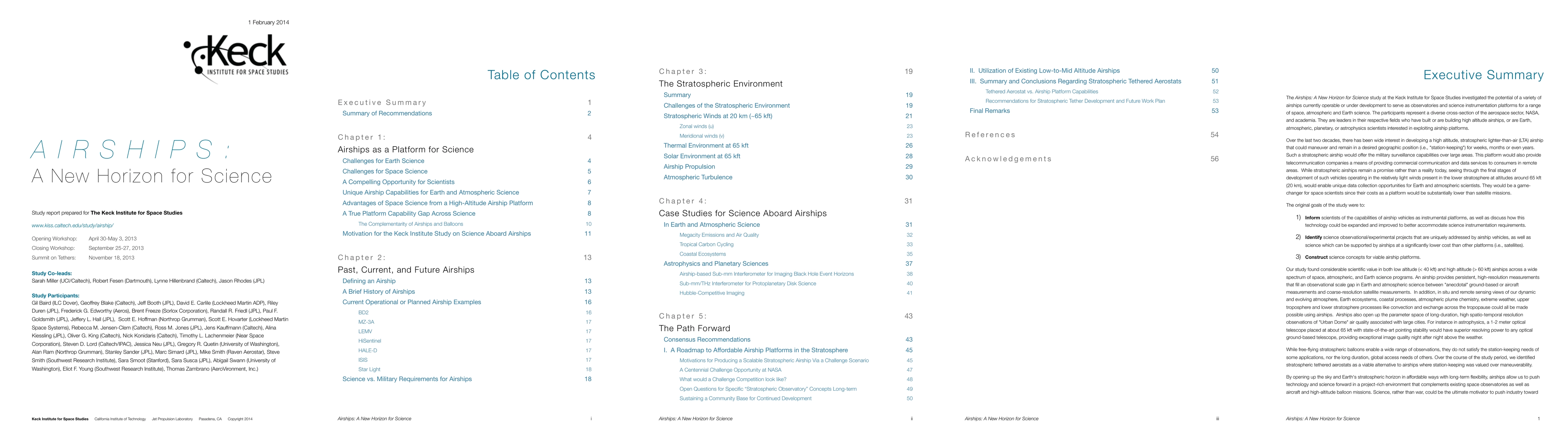 The "Airships: A New Horizon for Science" study at the Keck Institute for Space Studies investigated the potential of a variety of airships currently operable or under development to serve as observatories and science instrumentation platforms for a range of space, atmospheric, and Earth science. The participants represent a diverse cross-section of the aerospace sector, NASA, and academia. Over the last two decades, there has been wide interest in developing a high altitude, stratospheric lighter-than-air (LTA) airship that could maneuver and remain in a desired geographic position (i.e., "station-keeping") for weeks, months or even years. Our study found considerable scientific value in both low altitude (< 40 kft) and high altitude (> 60 kft) airships across a wide spectrum of space, atmospheric, and Earth science programs. Over the course of the study period, we identified stratospheric tethered aerostats as a viable alternative to airships where station-keeping was valued over maneuverability. By opening up the sky and Earth's stratospheric horizon in affordable ways with long-term flexibility, airships allow us to push technology and science forward in a project-rich environment that complements existing space observatories as well as aircraft and high-altitude balloon missions.