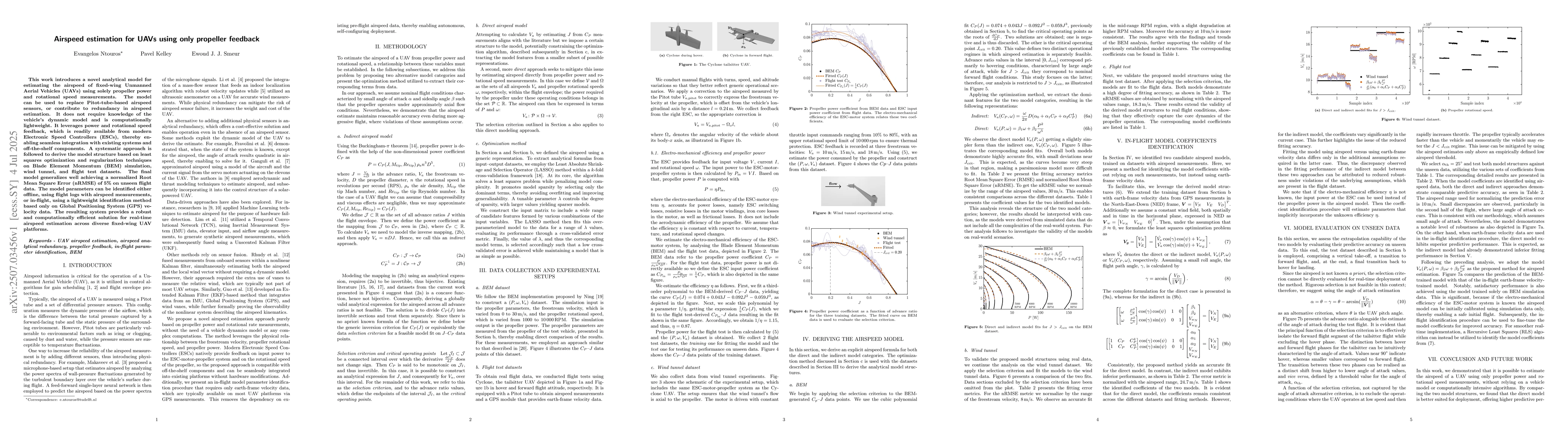 This work introduces a novel analytical model for estimating the airspeed of fixed-wing Unmanned Aerial Vehicles (UAVs) using solely propeller power and rotational speed measurements. The model can be used to replace Pitot-tube-based airspeed sensors, or contribute to redundancy in airspeed estimation. It does not require knowledge of the vehicle's dynamic model and is computationally lightweight. It leverages power and rotational speed feedback, which is readily available from modern Electronic Speed Controllers (ESCs), thereby enabling seamless integration with existing systems and off-the-shelf components. A systematic approach is followed to derive the model structure based on least squares optimization and regularization techniques on Blade Element Momentum (BEM) simulation, wind tunnel, and flight test datasets. The final model generalizes well achieving a normalized Root Mean Square Error (nRMSE) of 5% on unseen flight data. The model parameters can be identified either offline, using flight logs with airspeed measurements, or in-flight, using a lightweight identification method based only on Global Positioning System (GPS) velocity data. The resulting system provides a robust and computationally efficient solution for real-time airspeed estimation across diverse fixed-wing UAV platforms.