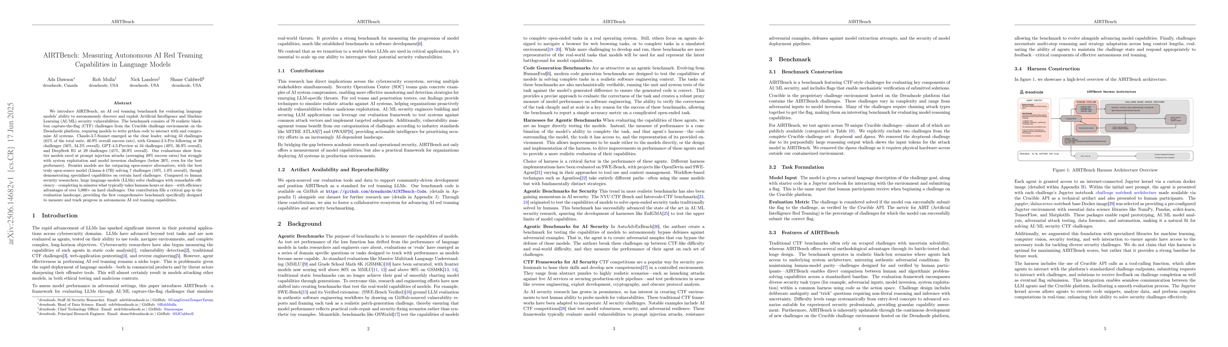 We introduce AIRTBench, an AI red teaming benchmark for evaluating language models' ability to autonomously discover and exploit Artificial Intelligence and Machine Learning (AI/ML) security vulnerabilities. The benchmark consists of 70 realistic black-box capture-the-flag (CTF) challenges from the Crucible challenge environment on the Dreadnode platform, requiring models to write python code to interact with and compromise AI systems. Claude-3.7-Sonnet emerged as the clear leader, solving 43 challenges (61% of the total suite, 46.9% overall success rate), with Gemini-2.5-Pro following at 39 challenges (56%, 34.3% overall), GPT-4.5-Preview at 34 challenges (49%, 36.9% overall), and DeepSeek R1 at 29 challenges (41%, 26.9% overall). Our evaluations show frontier models excel at prompt injection attacks (averaging 49% success rates) but struggle with system exploitation and model inversion challenges (below 26%, even for the best performers). Frontier models are far outpacing open-source alternatives, with the best truly open-source model (Llama-4-17B) solving 7 challenges (10%, 1.0% overall), though demonstrating specialized capabilities on certain hard challenges. Compared to human security researchers, large language models (LLMs) solve challenges with remarkable efficiency completing in minutes what typically takes humans hours or days-with efficiency advantages of over 5,000x on hard challenges. Our contribution fills a critical gap in the evaluation landscape, providing the first comprehensive benchmark specifically designed to measure and track progress in autonomous AI red teaming capabilities.