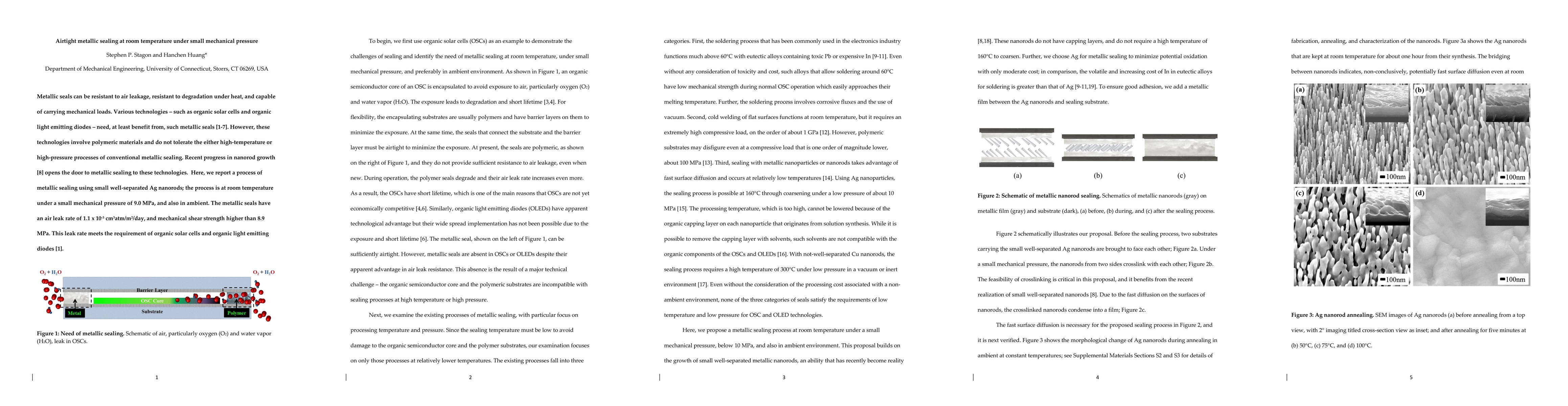 This paper presents a method for airtight metallic sealing at room temperature using small, well-separated Ag nanorods under a mechanical pressure of 9.0 MPa, achieving an air leak rate of 1.1 x 10^-3 cm^3atm/m^2/day and mechanical shear strength over 8.9 MPa, suitable for organic solar cells and OLEDs.