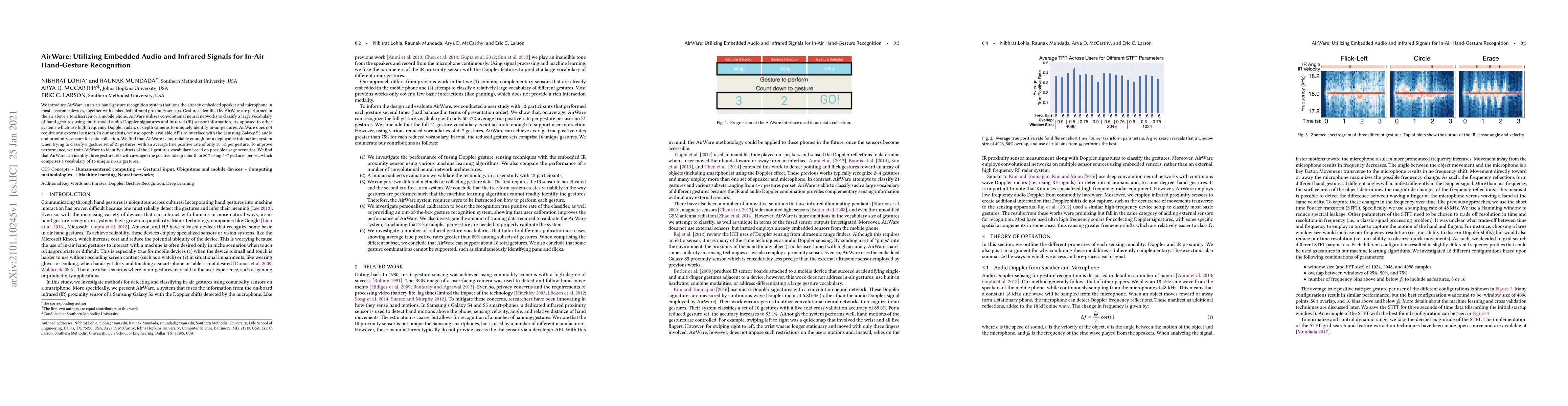 AirWare employs embedded audio and infrared signals for recognizing in-air hand gestures using existing device sensors, but struggles with a large gesture set, achieving only 50.5% accuracy. Improved performance is found with smaller, context-specific gesture subsets, reaching over 80% accuracy for 4-7 gestures.