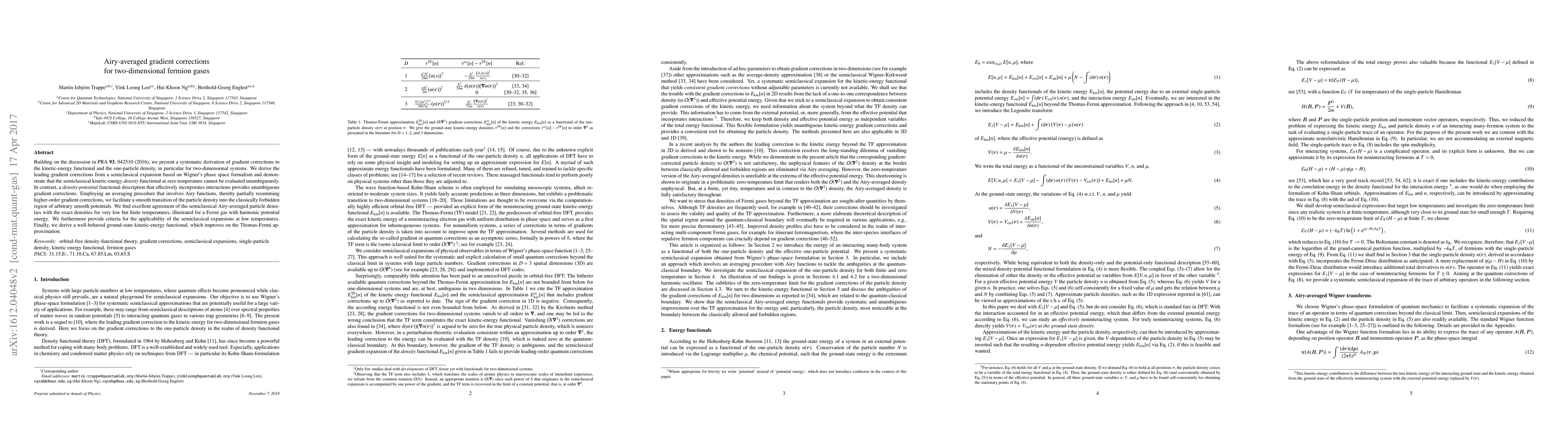 Building on the discussion in PRA 93, 042510 (2016), we present a systematic derivation of gradient corrections to the kinetic-energy functional and the one-particle density, in particular for two-dimensional systems. We derive the leading gradient corrections from a semiclassical expansion based on Wigner's phase space formalism and demonstrate that the semiclassical kinetic-energy density functional at zero temperature cannot be evaluated unambiguously. In contrast, a density-potential functional description that effectively incorporates interactions provides unambiguous gradient corrections. Employing an averaging procedure that involves Airy functions, thereby partially resumming higher-order gradient corrections, we facilitate a smooth transition of the particle density into the classically forbidden region of arbitrary smooth potentials. We find excellent agreement of the semiclassical Airy-averaged particle densities with the exact densities for very low but finite temperatures, illustrated for a Fermi gas with harmonic potential energy. We furthermore provide criteria for the applicability of the semiclassical expansions at low temperatures. Finally, we derive a well-behaved ground-state kinetic-energy functional, which improves on the Thomas-Fermi approximation.