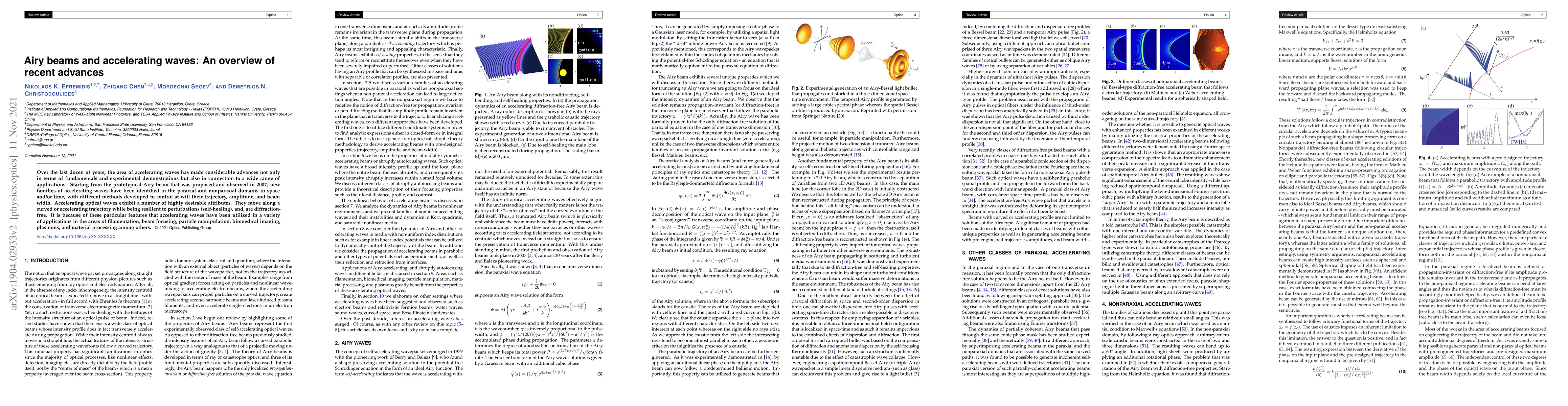 Over the past decade, accelerating waves, beginning with the 2007 Airy beam discovery, have seen significant progress. These waves, moving in curved paths, self-healing, and diffraction-free, are now applied in diverse fields including filamentation, imaging, and material processing.