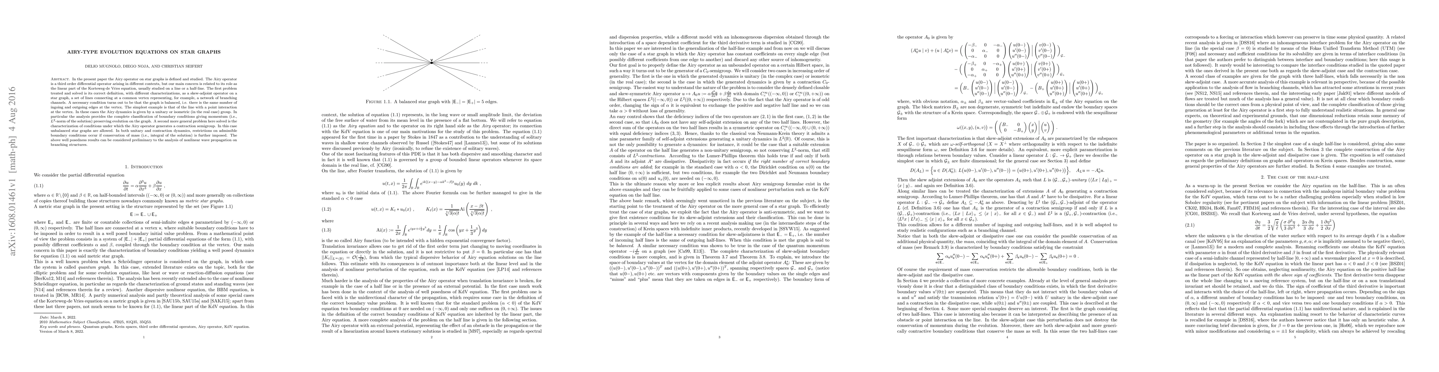 In the present paper the Airy operator on star graphs is defined and studied. The Airy operator is a third order differential operator arising in different contexts, but our main concern is related to its role as the linear part of the Korteweg-de Vries equation, usually studied on a line or a half-line. The first problem treated and solved is its correct definition, with different characterizations, as a skew-adjoint operator on a star graph, a set of lines connecting at a common vertex representing, for example, a network of branching channels. A necessary condition turns out to be that the graph is balanced, i.e. there is the same number of ingoing and outgoing edges at the vertex. The simplest example is that of the line with a point interaction at the vertex. In these cases the Airy dynamics is given by a unitary or isometric (in the real case) group. In particular the analysis provides the complete classification of boundary conditions giving momentum (i.e., $L^2$-norm of the solution) preserving evolution on the graph. A second more general problem here solved is the characterization of conditions under which the Airy operator generates a contraction semigroup. In this case unbalanced star graphs are allowed. In both unitary and contraction dynamics, restrictions on admissible boundary conditions occur if conservation of mass (i.e., integral of the solution) is further imposed. The above well posedness results can be considered preliminary to the analysis of nonlinear wave propagation on branching structures.