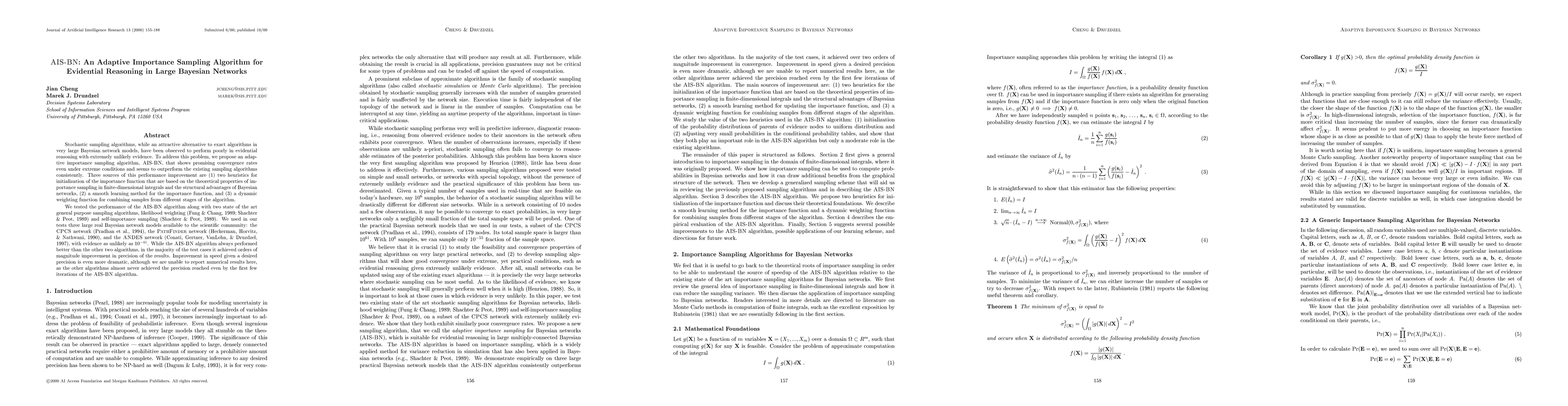 The paper proposes AIS-BN, an adaptive importance sampling algorithm for evidential reasoning in large Bayesian networks, which significantly outperforms existing sampling methods, especially under extreme conditions. The improvements are attributed to heuristic initialization, a smooth learning method, and a dynamic weighting function. Tests on large Bayesian networks showed AIS-BN achieved orders of magnitude better precision and speed improvements.