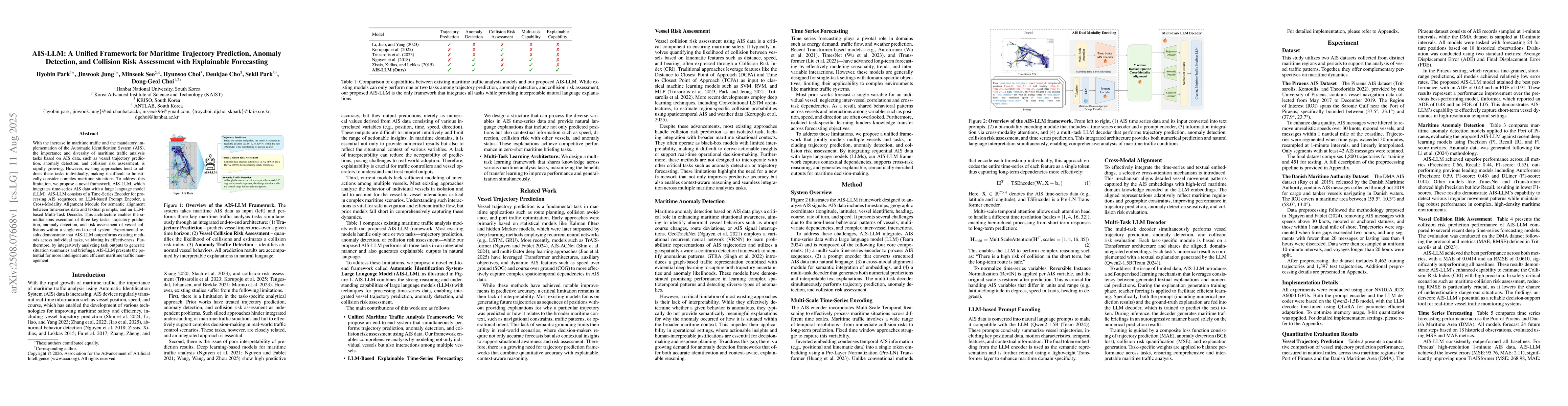 AIS-LLM presents a novel unified framework that combines time-series AIS data with LLMs to perform trajectory prediction, anomaly detection, and collision risk assessment simultaneously, providing context-aware natural language explanations.