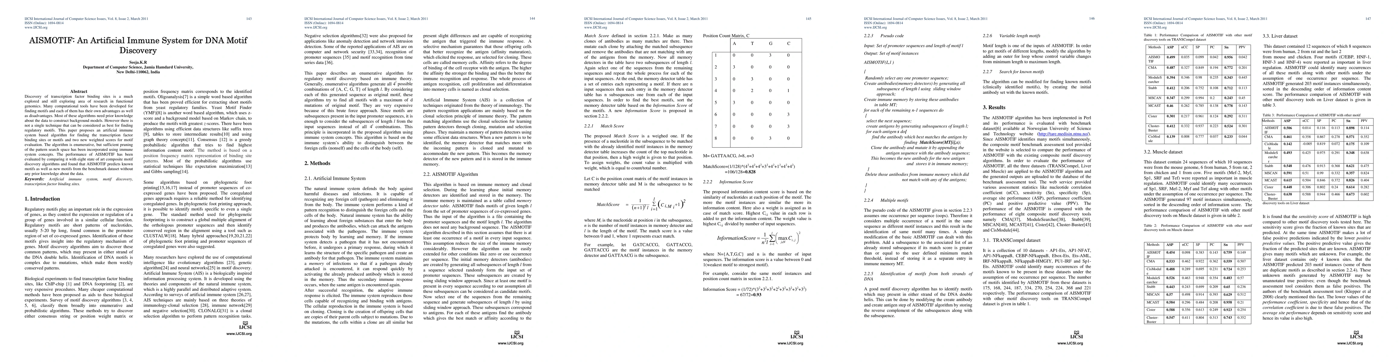 A new artificial immune system-based algorithm, AISMOTIF, has been developed to discover transcription factor binding sites without prior knowledge of the data. It outperforms existing algorithms in predicting both known and novel motifs from a benchmark dataset.