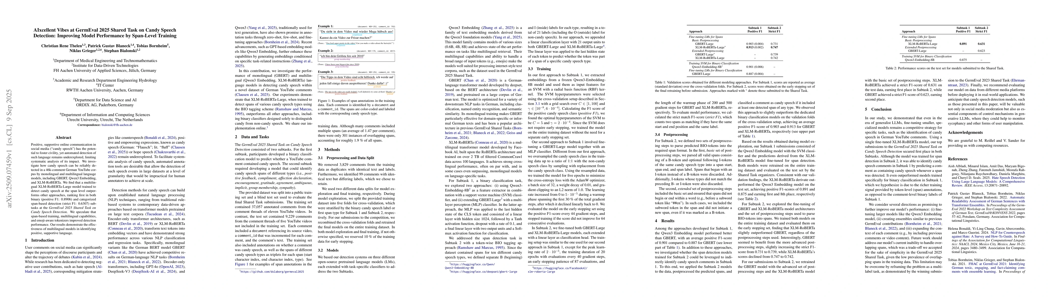 Positive, supportive online communication in social media (candy speech) has the potential to foster civility, yet automated detection of such language remains underexplored, limiting systematic analysis of its impact. We investigate how candy speech can be reliably detected in a 46k-comment German YouTube corpus by monolingual and multilingual language models, including GBERT, Qwen3 Embedding, and XLM-RoBERTa. We find that a multilingual XLM-RoBERTa-Large model trained to detect candy speech at the span level outperforms other approaches, ranking first in both binary positive F1: 0.8906) and categorized span-based detection (strict F1: 0.6307) subtasks at the GermEval 2025 Shared Task on Candy Speech Detection. We speculate that span-based training, multilingual capabilities, and emoji-aware tokenizers improved detection performance. Our results demonstrate the effectiveness of multilingual models in identifying positive, supportive language.