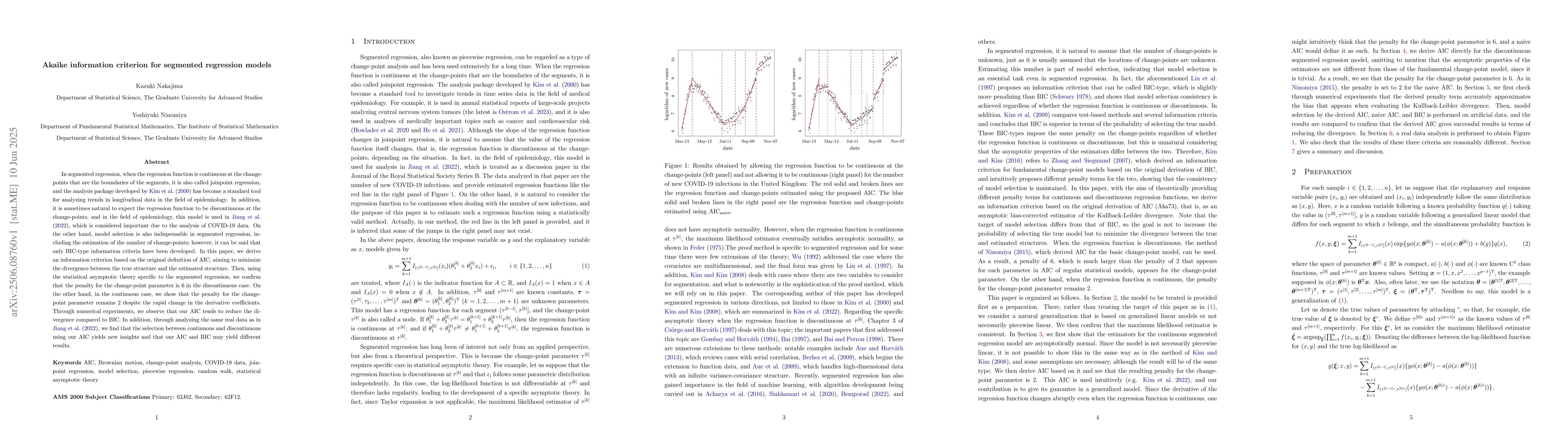 This research paper introduces a new information criterion for segmented regression models that can handle both continuous and discontinuous regression functions, providing insights into change-point detection and model selection in epidemiology and other fields.