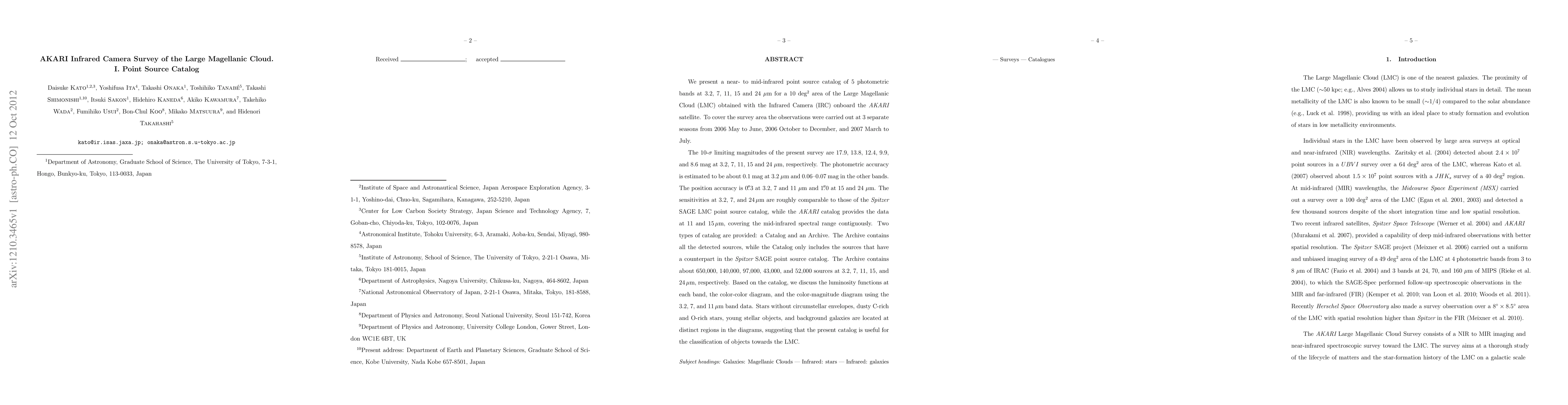 The AKARI Infrared Camera survey of the Large Magellanic Cloud (LMC) provides a comprehensive near- to mid-infrared point source catalog in five bands, revealing detailed luminosity functions and classifications of stars, young stellar objects, and galaxies. The survey's high sensitivity and accuracy facilitate the study of various astronomical objects within the LMC.