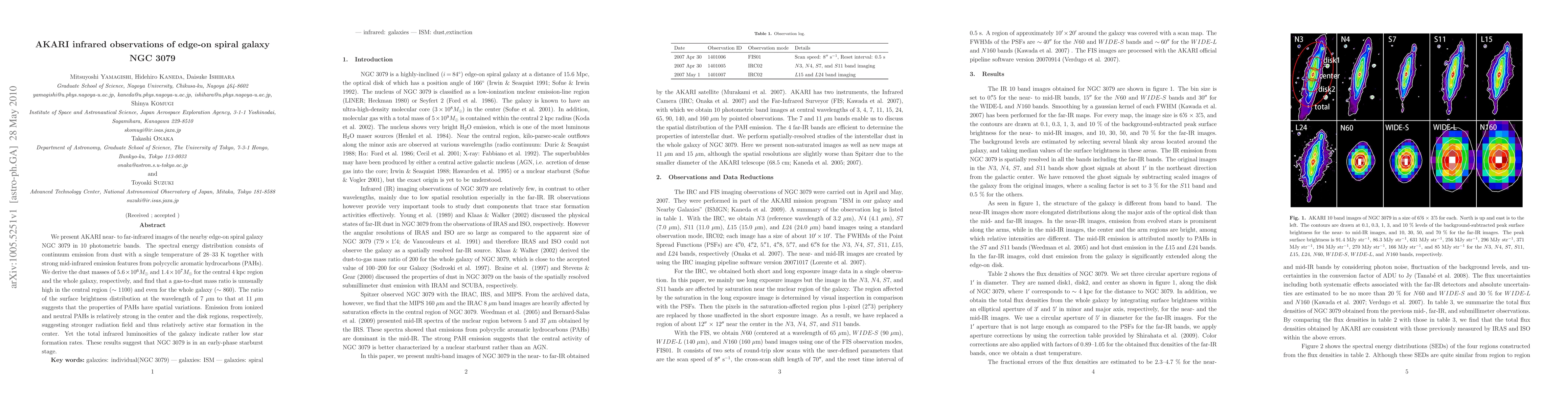 The AKARI infrared observations of edge-on spiral galaxy NGC 3079 reveal high dust masses and an unusually high gas-to-dust mass ratio, suggesting a low star formation rate despite strong PAH emission features.