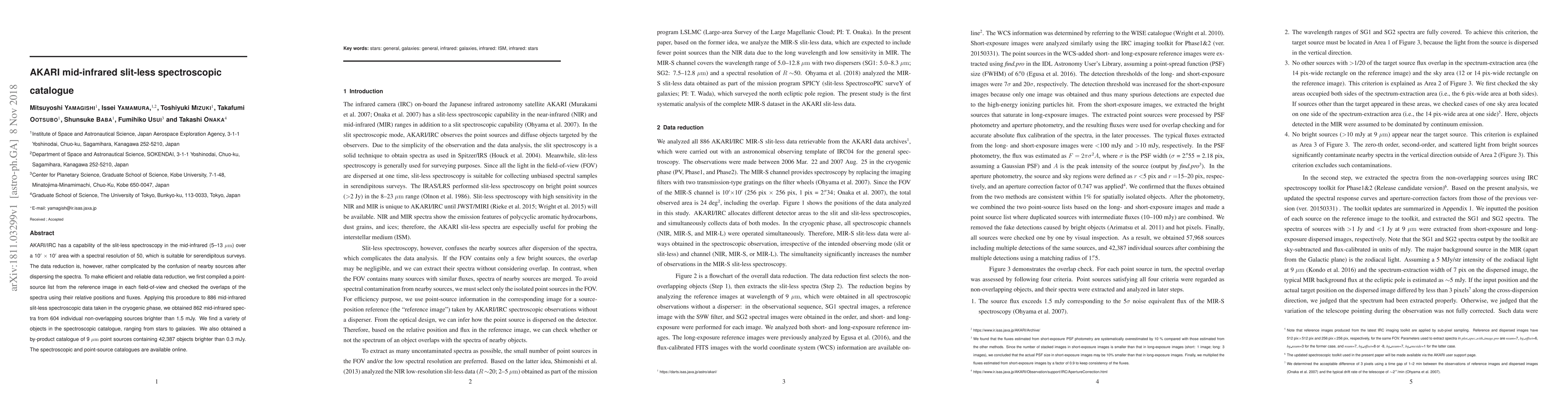 Researchers created a catalogue of 862 mid-infrared spectra from 604 non-overlapping sources, including stars and galaxies, using the AKARI/IRC telescope's slit-less spectroscopy technique.