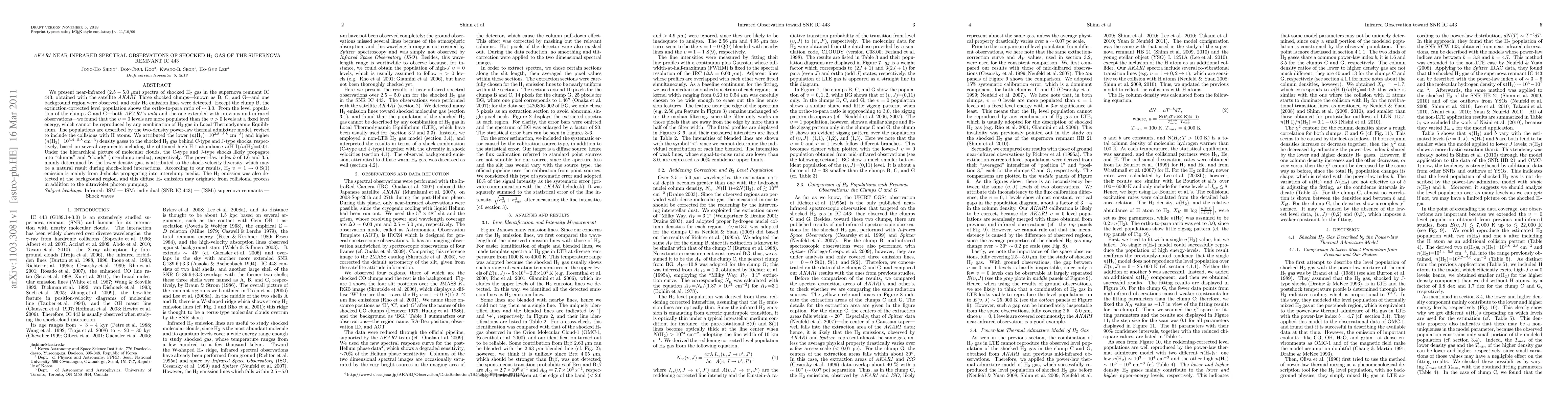 Researchers studied near-infrared spectra of shocked H2 gas in a supernova remnant using satellite AKARI. They found that the gas exhibited unusual level populations, which they attributed to collisions with atomic hydrogen and shock velocity diversity.