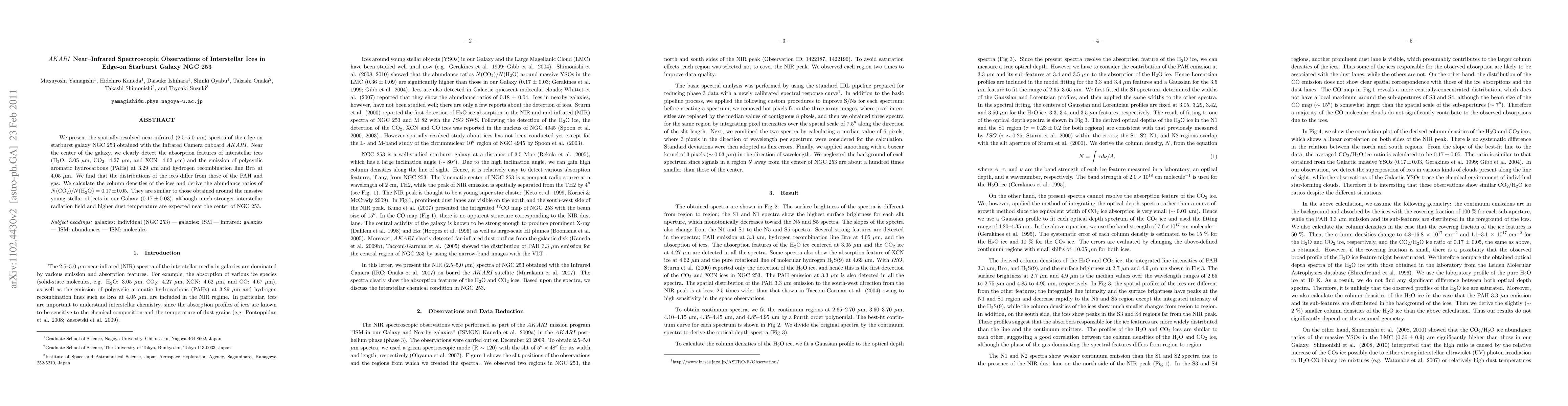 This study uses AKARI's near-infrared spectroscopy to analyze interstellar ices in the starburst galaxy NGC253, detecting absorption features of H_2O, CO_2, and XCN, alongside PAHs and hydrogen recombination lines. The ice distributions differ from those of PAHs and gas, with CO_2/H_2O abundance ratios similar to those found near young stellar objects in our Galaxy.