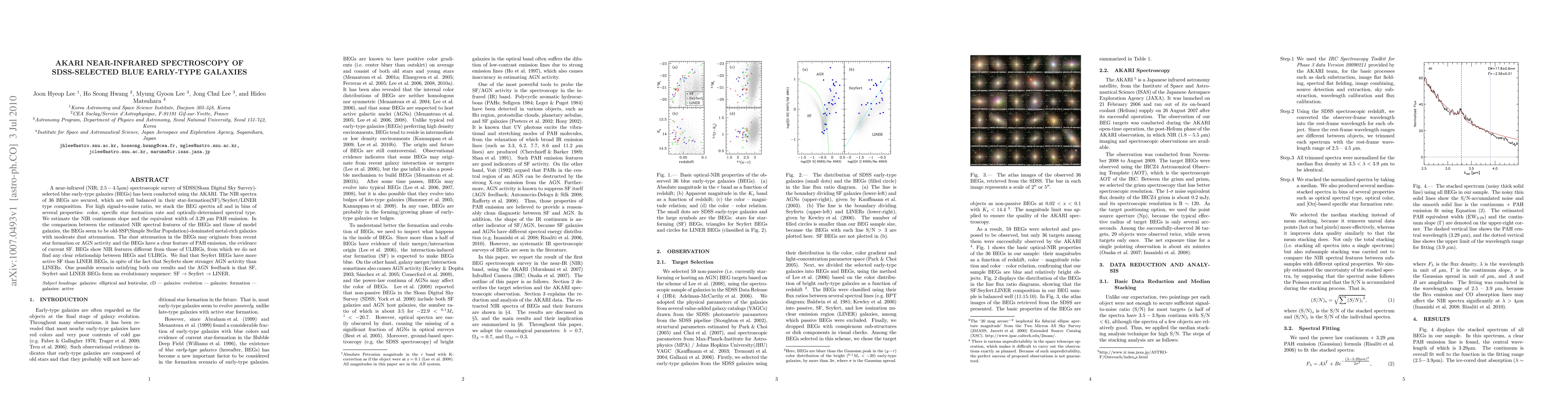 A near-infrared (NIR; 2.5 - 4.5 micron) spectroscopic survey of SDSS(Sloan Digital Sky Survey)-selected blue early-type galaxies (BEGs) has been conducted using the AKARI. The NIR spectra of 36 BEGs are secured, which are well balanced in their star-formation(SF)/Seyfert/LINER type composition. For high signal-to-noise ratio, we stack the BEG spectra all and in bins of several properties: color, specific star formation rate and optically-determined spectral type. We estimate the NIR continuum slope and the equivalent width of 3.29 micron PAH emission. In the comparison between the estimated NIR spectral features of the BEGs and those of model galaxies, the BEGs seem to be old-SSP(Simple Stellar Population)-dominated metal-rich galaxies with moderate dust attenuation. The dust attenuation in the BEGs may originate from recent star formation or AGN activity and the BEGs have a clear feature of PAH emission, the evidence of current SF. BEGs show NIR features different from those of ULIRGs, from which we do not find any clear relationship between BEGs and ULIRGs. We find that Seyfert BEGs have more active SF than LINER BEGs, in spite of the fact that Seyferts show stronger AGN activity than LINERs. One possible scenario satisfying both our results and the AGN feedback is that SF, Seyfert and LINER BEGs form an evolutionary sequence: SF - Seyfert - LINER.