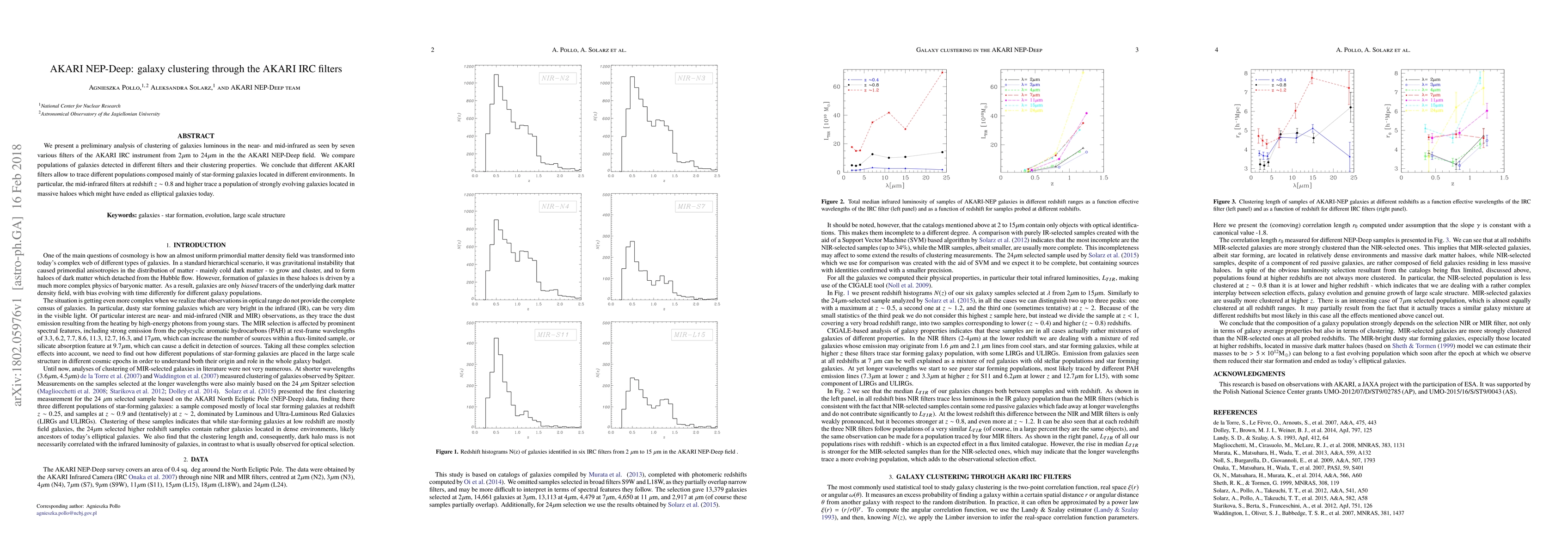 We present a preliminary analysis of clustering of galaxies luminous in the near- and mid-infrared as seen by seven various ilters of the AKARI IRC instrument from 2 $\mu$m to 24 $\mu$m in the the AKARI NEP-Deep field. We compare populations of galaxies detected in different filters and their clustering properties. We conclude that different AKARI filters allow to trace different populations composed mainly of star-forming galaxies located in different environments. In particular, the mid-infrared filters at redshift z $\sim$ 0.8 and higher trace a population of strongly evolving galaxies located in massive haloes which might have ended as elliptical galaxies today.