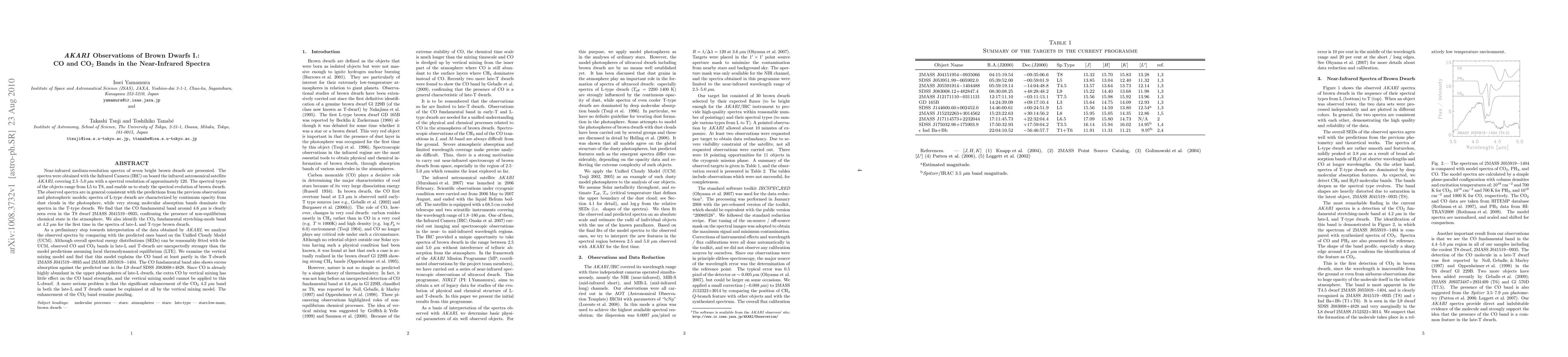 This paper presents near-infrared spectra of seven brown dwarfs from AKARI satellite observations, revealing CO and CO_2 bands. The study finds that the CO band is stronger than expected in late-L and T-type dwarfs, partially explained by vertical mixing, but the enhancement of the CO_2 band remains unexplained.