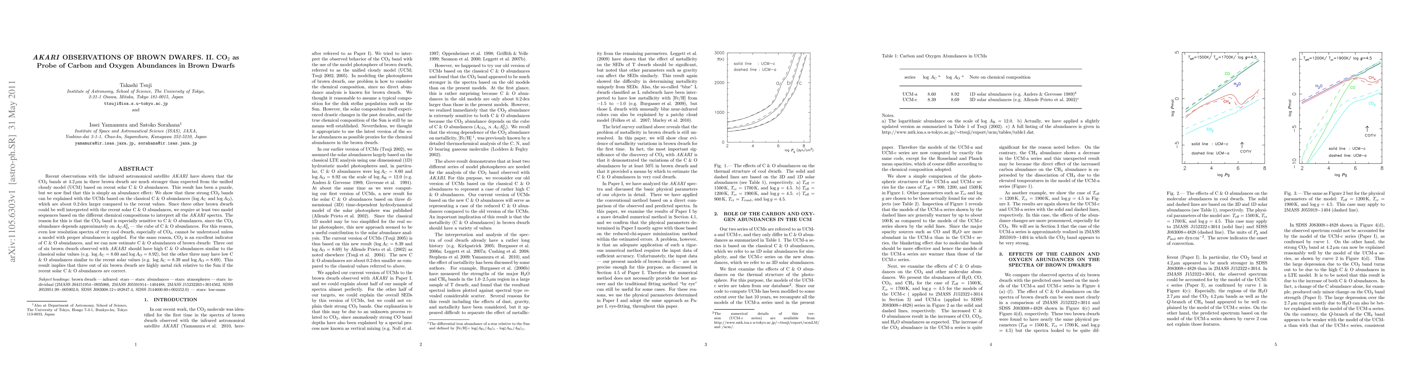The AKARI satellite observations reveal that CO2 bands in three brown dwarfs are stronger than predicted by models using recent solar C & O abundances, suggesting these brown dwarfs have higher classical C & O abundances. This indicates the need for multiple models to interpret the spectra, as CO2 bands are highly sensitive to C & O abundances.