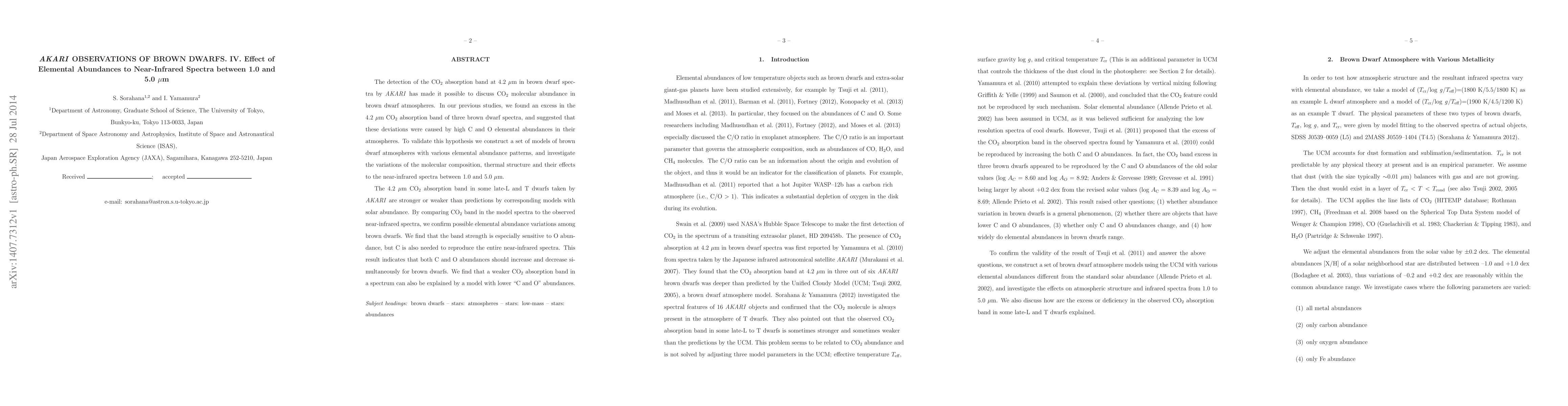 The AKARI observations of brown dwarfs reveal variations in the CO_2 absorption band at 4.2 μm, suggesting deviations in C and O elemental abundances. Models show that the strength of the CO_2 band is highly sensitive to oxygen abundance, with carbon abundance also playing a crucial role in matching observed near-infrared spectra.