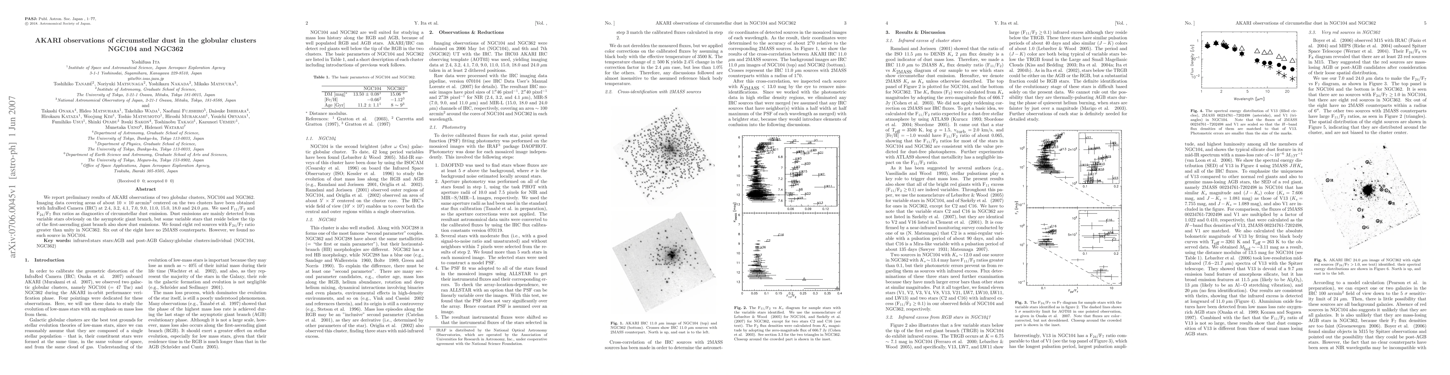 We report preliminary results of AKARI observations of two globular clusters, NGC104 and NGC362. Imaging data covering areas of about 10x10 arcmin^2 centered on the two clusters have been obtained with InfraRed Camera (IRC) at 2.4, 3.2, 4.1, 7.0, 9.0, 11.0, 15.0, 18.0 and 24.0 mu. We used F11/F2 and F24/F7 flux ratios as diagnostics of circumstellar dust emission. Dust emissions are mainly detected from variable stars obviously on the asymptotic giant branch, but some variable stars that reside below the tip of the first-ascending giant branch also show dust emissions. We found eight red sources with F24/F7 ratio greater than unity in NGC362. Six out of the eight have no 2MASS counterparts. However, we found no such source in NGC104.